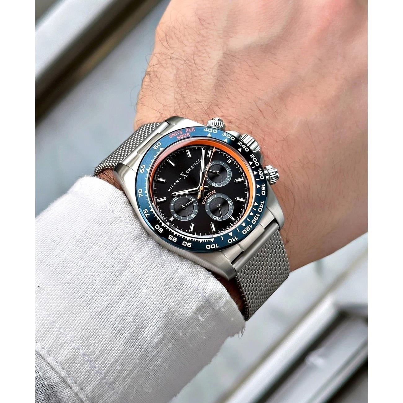 ساعت مچی مردانه میلانو اکسچنج milanoxchange با طراحی روزانه بند حصیر بافت استیل/ قاب گرد استیل سرمه ای و صفحه گرد مشکی با قابلیت داشتن شب نما / دو زمانه / کرنوگراف و موتور ژاپنی و انرژی باتری و مقاوم در برابر آب تا عمق 50 متر به همراه گارانتی بین المللی