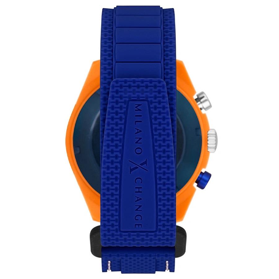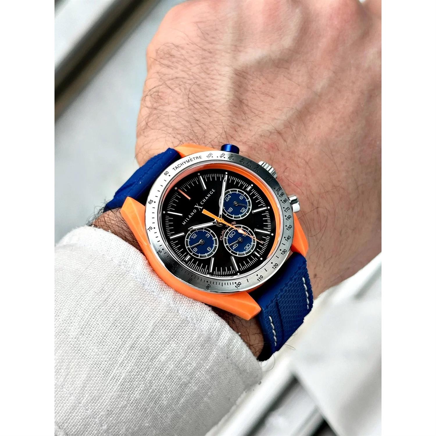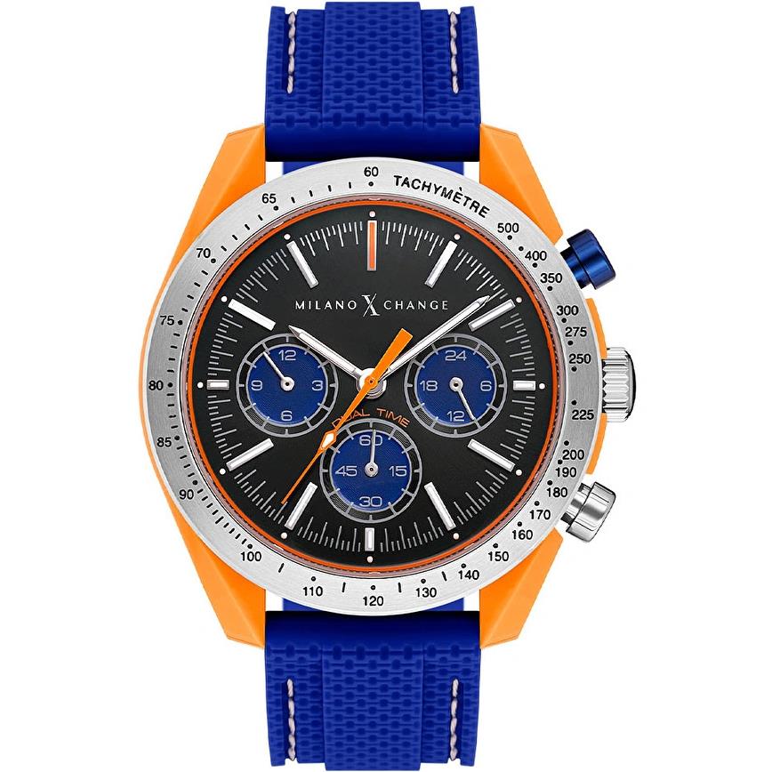 ساعت مچی مردانه میلانو اکسچنج milanoxchange با طراحی روزانه بند سیلیکونی سرمه ای / قاب گرد دو رنگ و صفحه گرد مشکی / سرمه ای با قابلیت داشتن شب نما / دو زمانه / کرنوگراف / زه تاچی متر و موتور ژاپنی و انرژی باتری و مقاوم در برابر آب تا عمق 50 متر به همراه گارانتی بین المللی