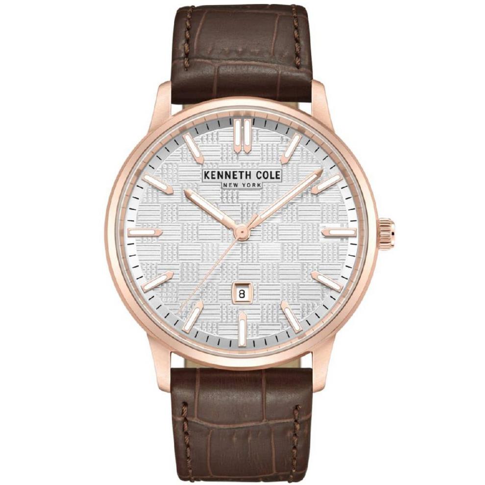 ساعت مچی مردانه کنت کول kenneth cole  با طراحی اسپرت بند چرمی قهوه ای و قاب فلزی مسی با صفحه گرد نقره ای و قابلیت داشتن شب نما تقویم و موتور ژاپنی با انرژی باتری و مقاومت در برابر آب تا عمق 30 متر به همراه دو سال گارانتی بین المللی