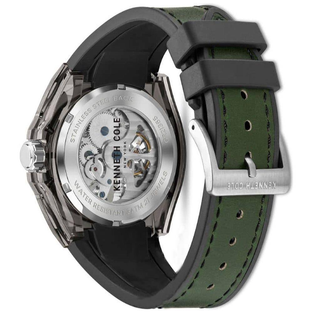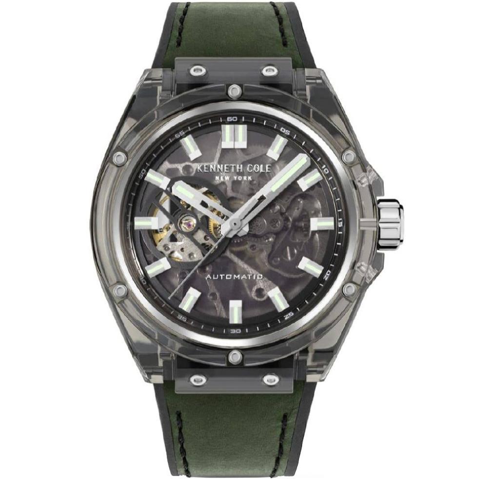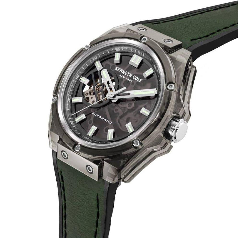 ساعت مچی مردانه کنت کول kenneth cole  با طراحی اسپرت بند سیلیکونی سبز و مشکی و قاب گرد طوسی با صفحه قلب باز طوسی و قابلیت داشتن شب نما و موتور اتوماتیک ژاپنی با انرژی مکانیکی و مقاومت در برابر آب تا عمق 30 متر به همراه دو سال گارانتی بین المللی