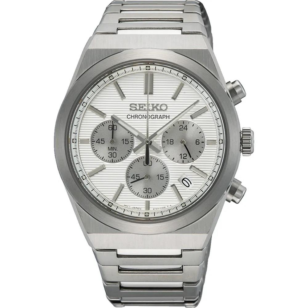 ساعت مچی مردانه سیکو SEIKO با طراحی روزانه بند استیل  با قاب استیل و صفحه گرد نقره ای سفید با شیشه ضد خراش و قابلیت داشتن تقویم/ کرنوگراف/ شب نما و موتور ژاپنی با انرژی باتری و مقاوم در برابر آب تا عمق 100 متر به همراه گارانتی بین المللی