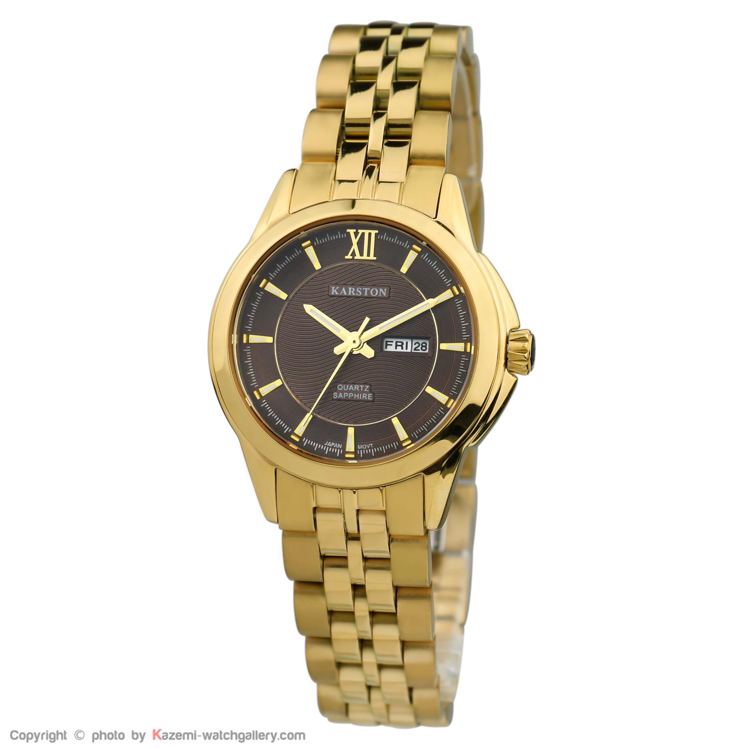 ساعت مچی زنانه کارستون karston با طراحی روزانه بند فلزی طلایی و قاب گرد فلزی طلایی و صفحه گرد قهوه ای با شیشه ضد خراش و قابلیت داشتن تقویم روزهای هفته شب نما و موتور ژاپنی با انرژِی باتری و مقاوم در برابر آب تا عمق 30 متر به همراه گارانتی بین المللی