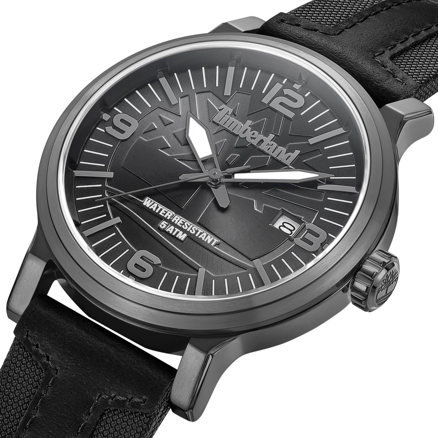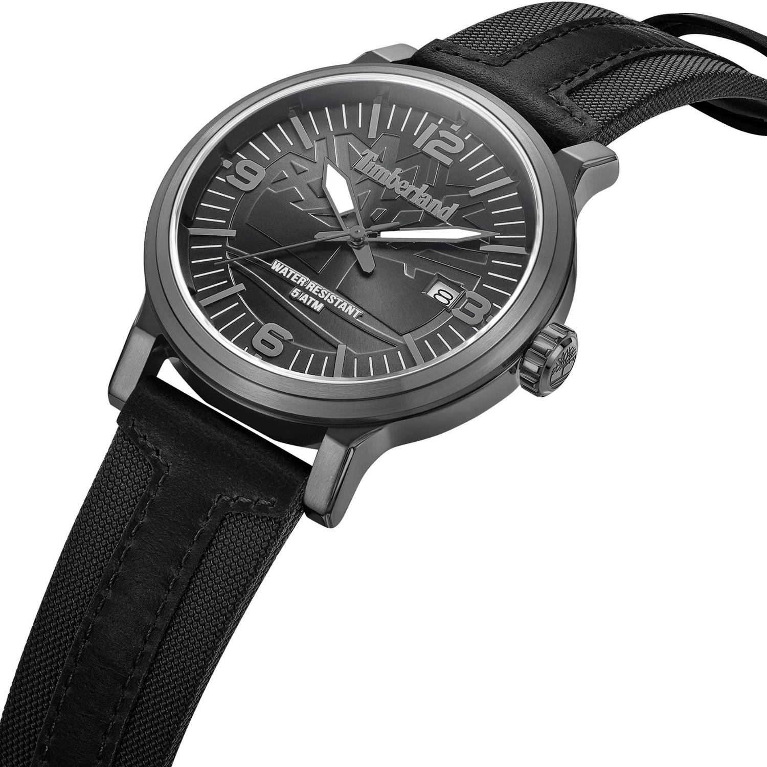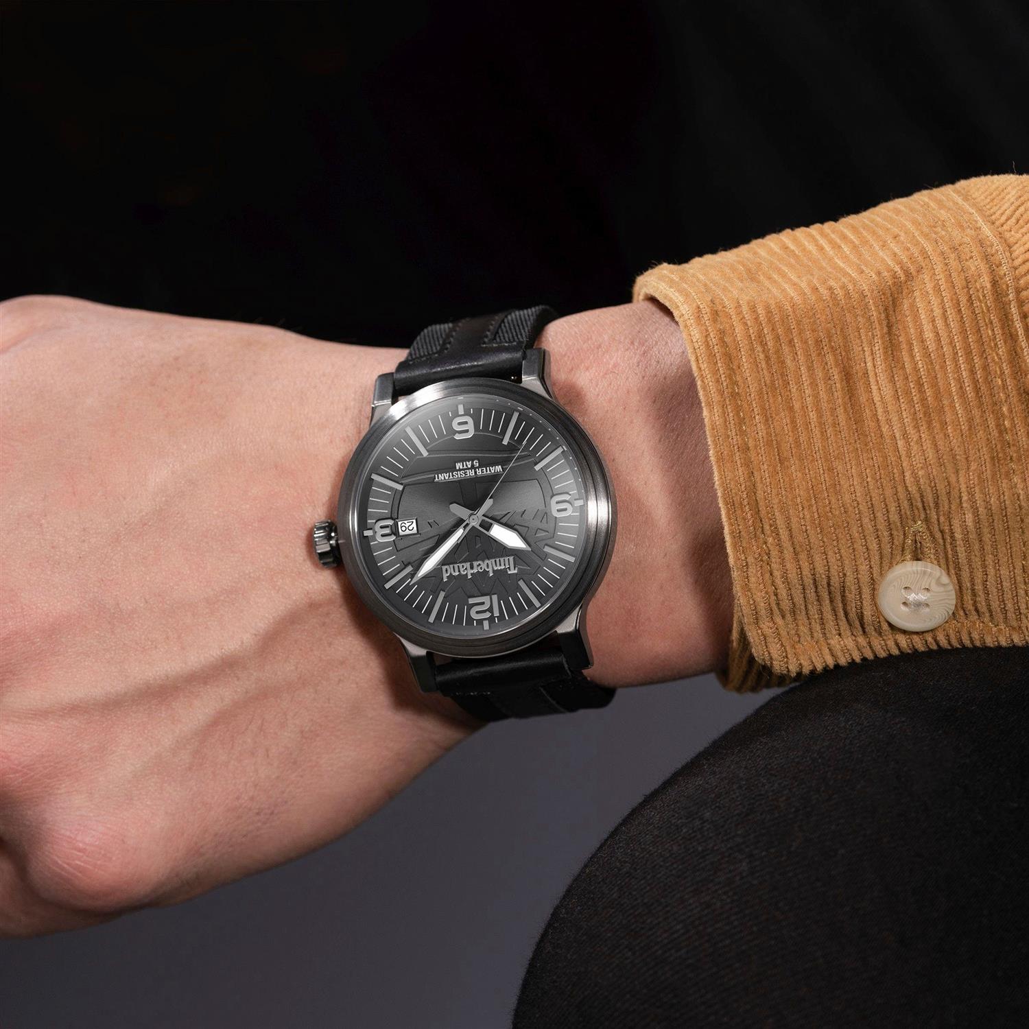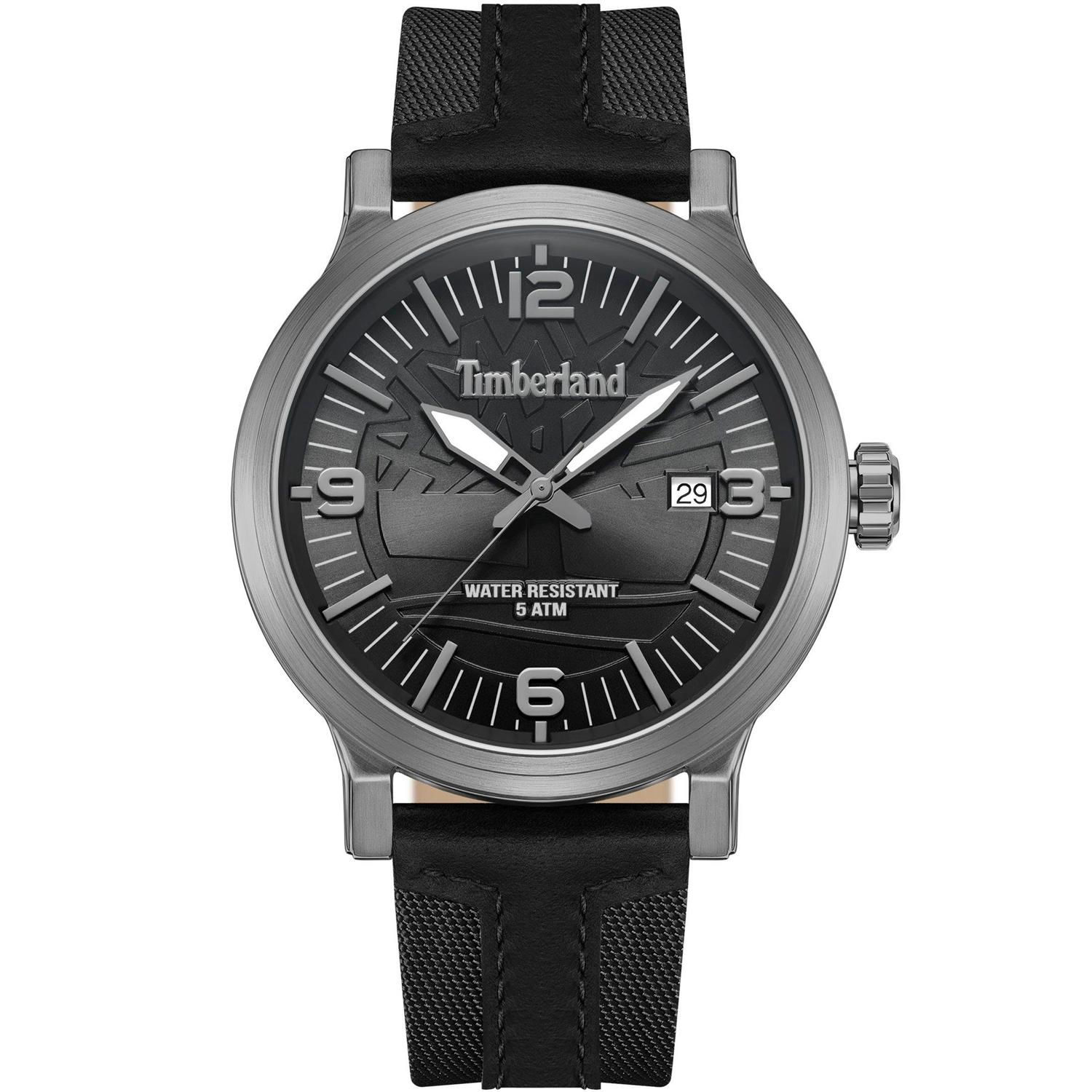 ساعت مچی مردانه تیمبرلند Timberland با طراحی روزانه بند مشکی و قاب فلزی طوسی و صفحه گرد مشکی با قابلیت تقویم , شب نما و موتور ژاپنی با انرژی باتری و مقاومت در برابر آب تا عمق 50 متر به همراه دو سال گارانتی بین المللی