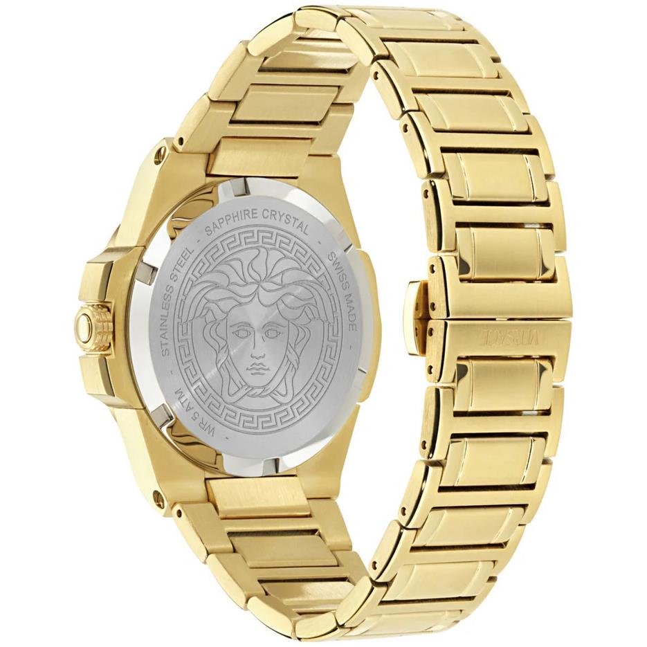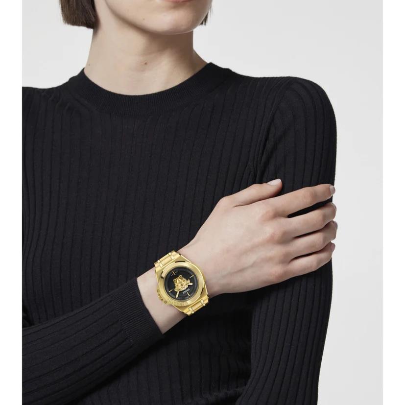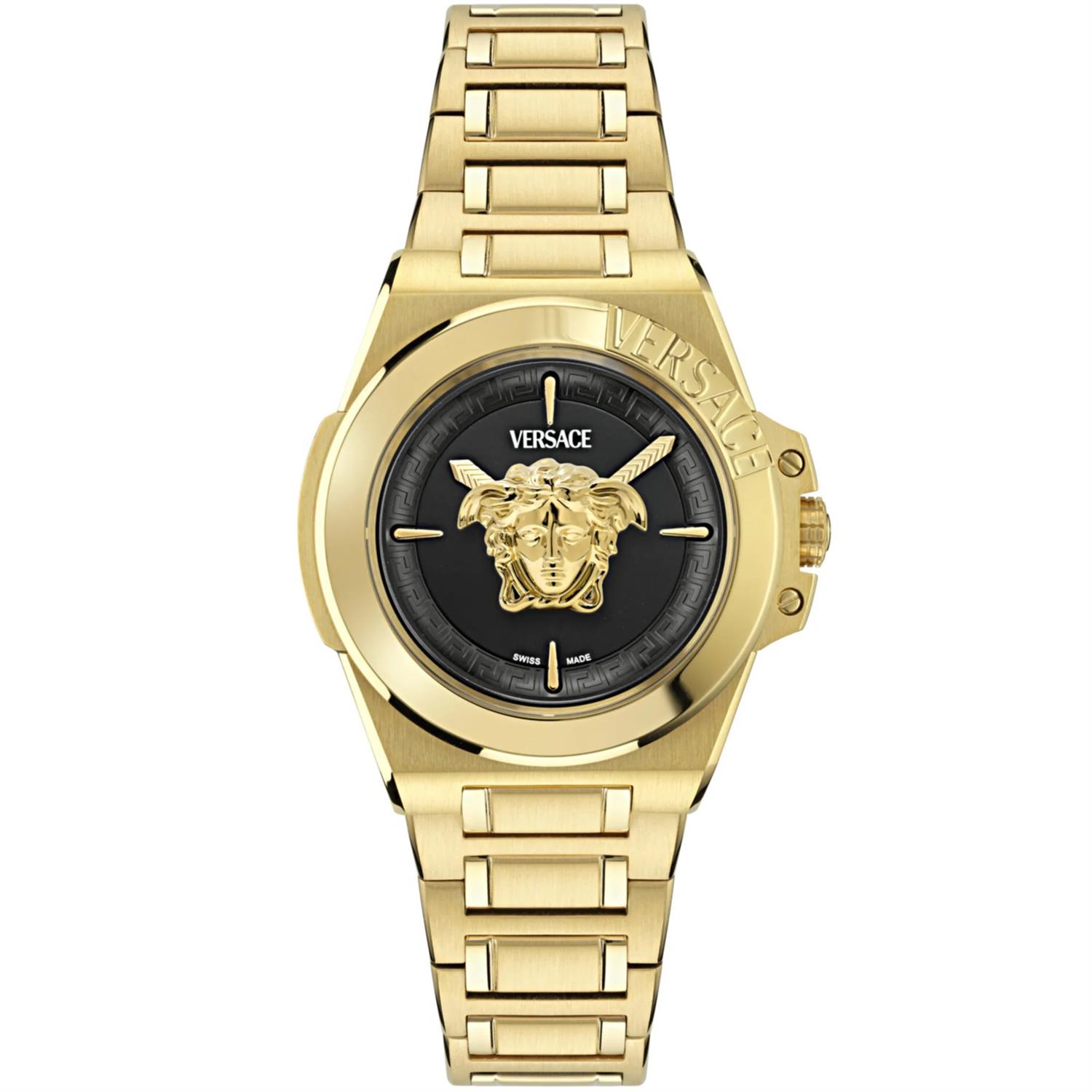 ساعت مچی زنانه Versace ورساچه با طراحی روزانه بند فلزی طلایی, قاب فلزی طلایی و صفحه گرد مشکی با شیشه ضد خراش  و موتور سوئیسی با انرژی باتری و مقاومت در برابر آب تا عمق 50 متر به همراه گارانتی بین المللی
