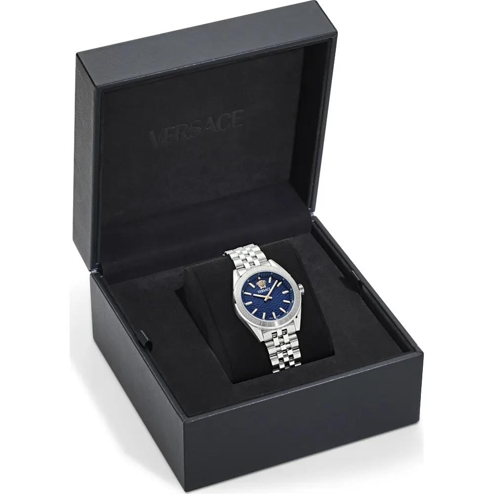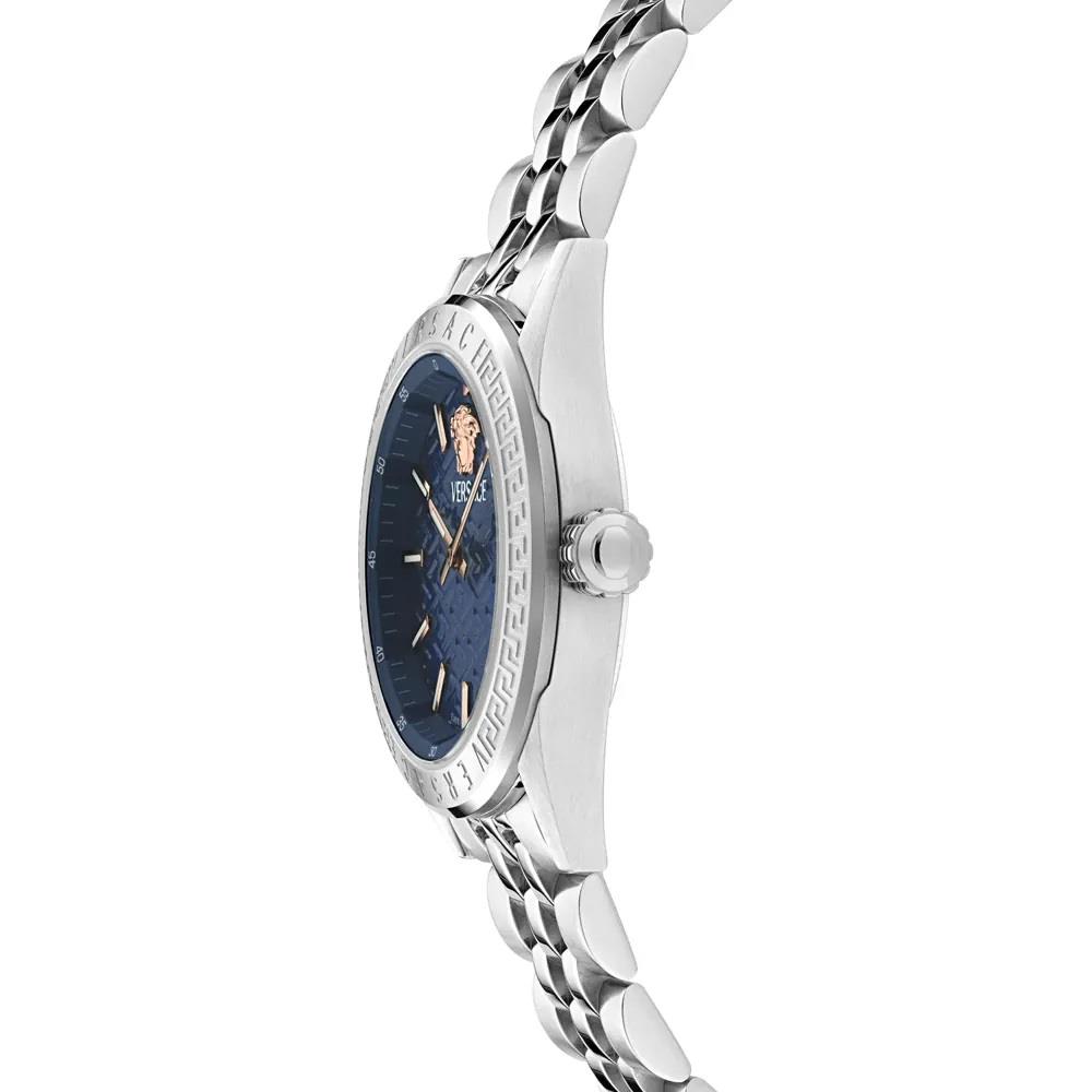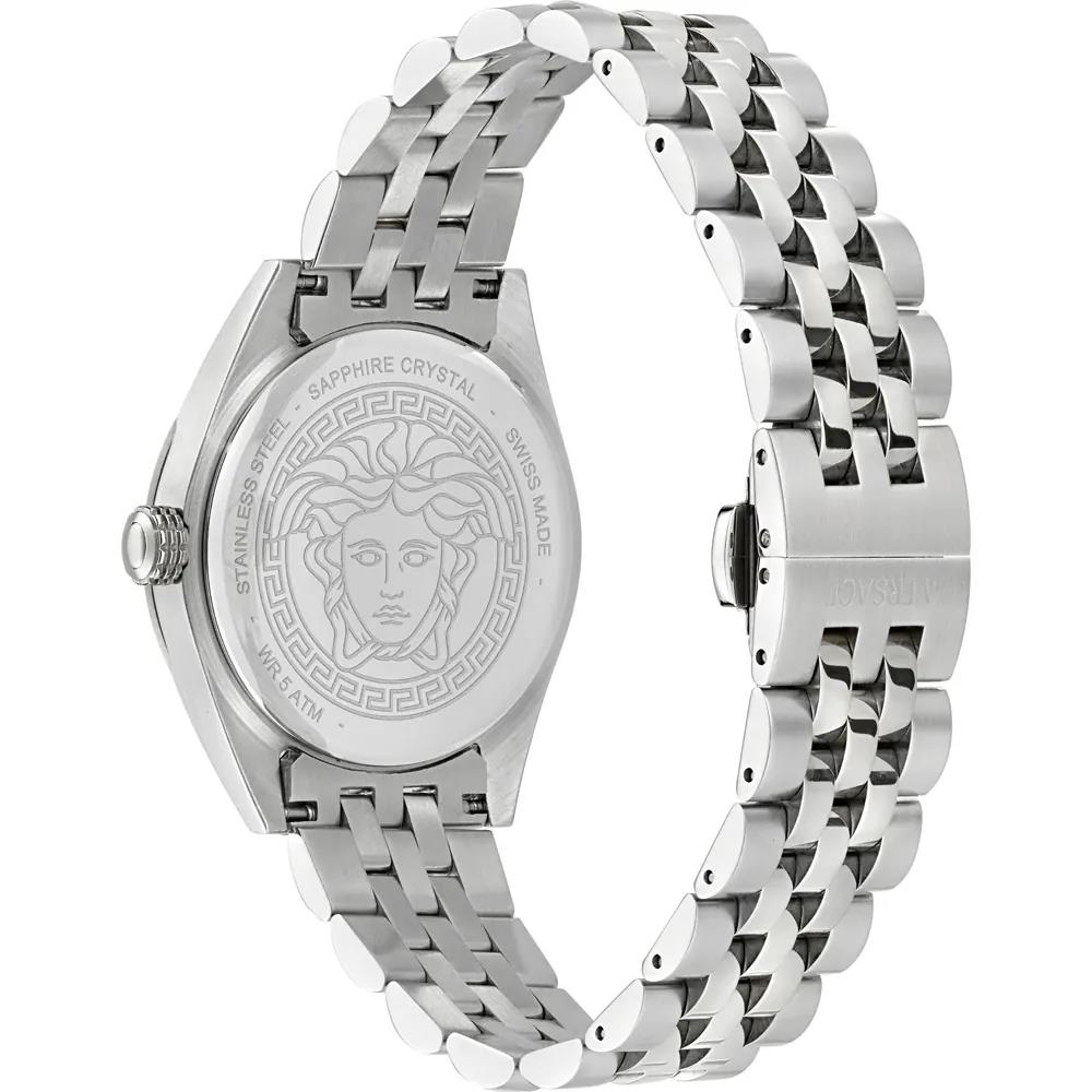 ساعت مچی زنانه Versace ورساچه با طراحی روزانه بند استیل طلایی, قاب استیل و صفحه گرد سرمه ای با شیشه ضد خراش و قابلیت داشتن شب نما و موتور سوئیسی با انرژی باتری و مقاومت در برابر آب تا عمق 50 متر به همراه گارانتی بین المللی