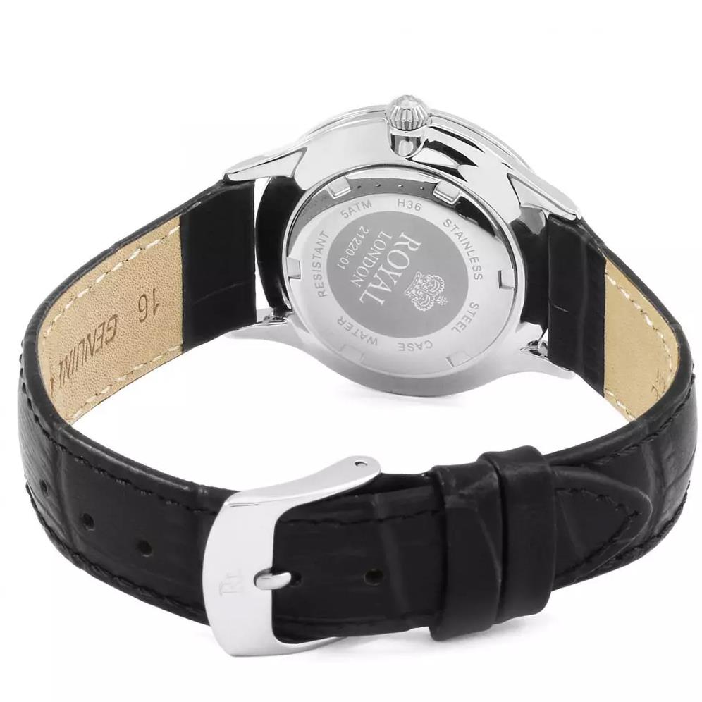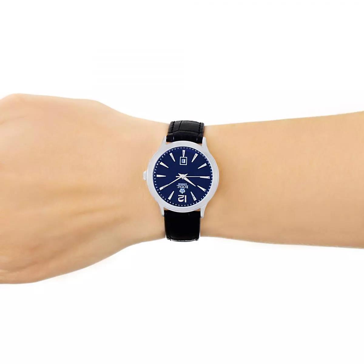 ساعت مچی زنانه ROYAL LONDON رویال لندن با طراحی روزانه بند چرمی و قاب استیل و صفحه گرد سرمه ای با قابلیت داشتن تقویم و موتور ژاپنی با انرژی باتری و مقاومت در برابر آب تا عمق 50 متر به همراه گارانتی بین المللی