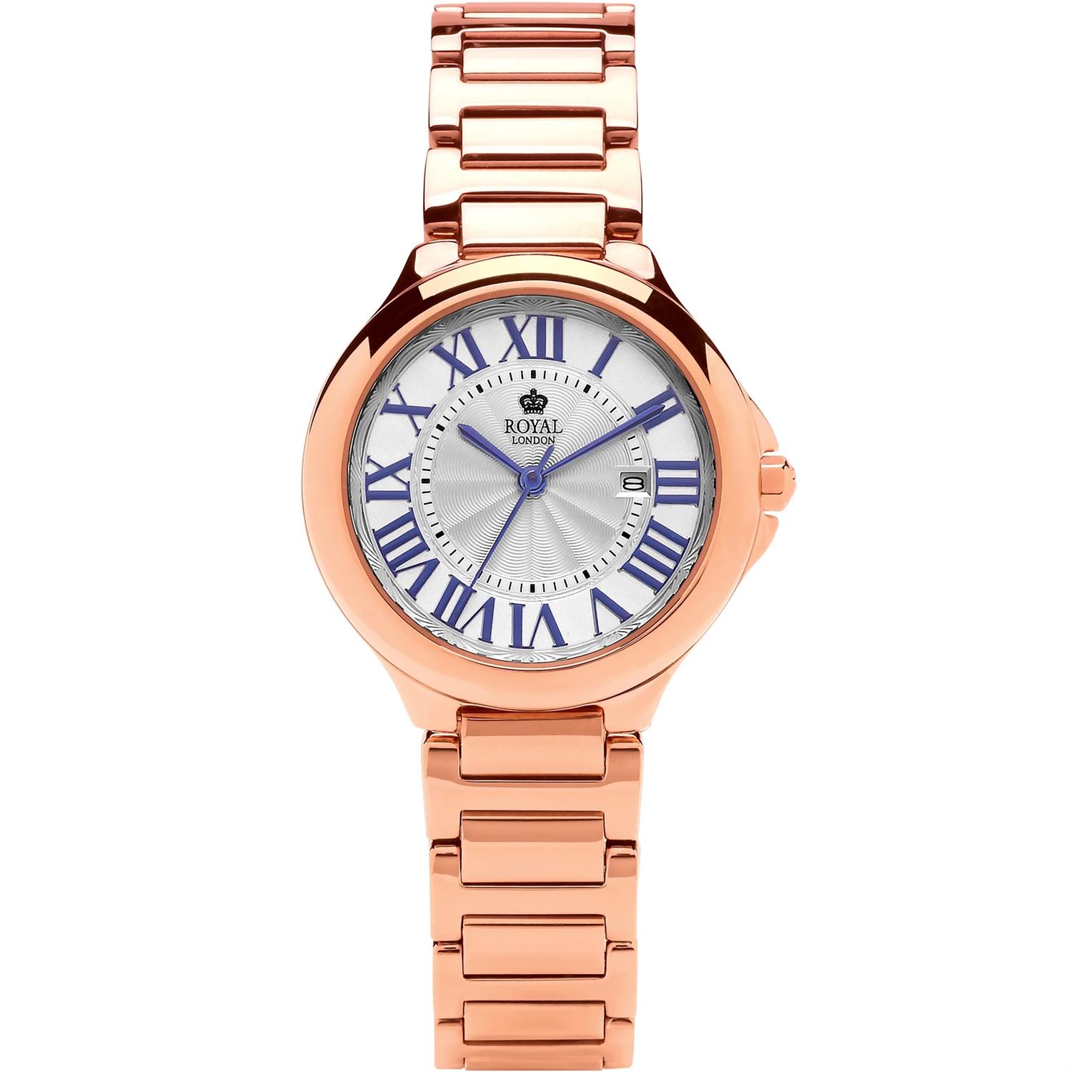 ساعت مچی زنانه ROYAL LONDON رویال لندن با طراحی روزانه بند فلزی مسی و قاب مسی و صفحه سفید با قابلیت داشتن تقویم و موتور ژاپنی با انرژی باتری و مقاومت در برابر آب تا عمق 30 متر به همراه گارانتی بین المللی
