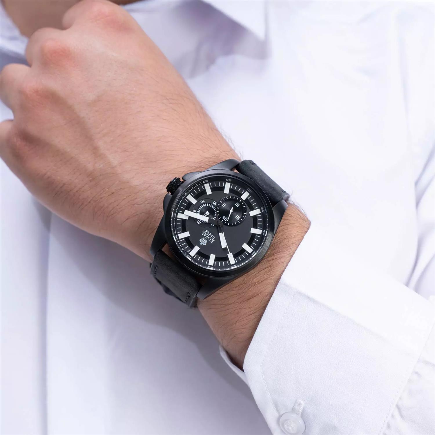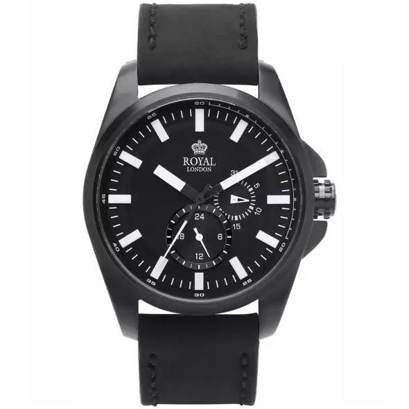 ساعت مچی مردانه ROYAL LONDON رویال لندن با طراحی روزانه بند چرمی و قاب فلزی مشکی و صفحه گرد مشکی با قابلیت داشتن تقویم روز و شب شب نما و موتور ژاپنی با انرژی باتری و مقاومت در برابر آب تا عمق 100متر به همراه گارانتی بین المللی