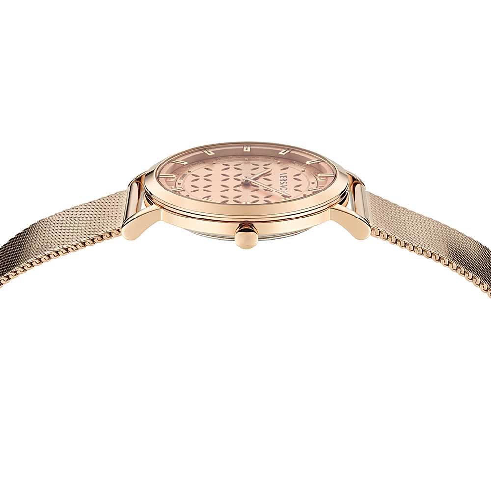 ساعت مچی زنانه Versace ورساچه با طراحی روزانه بند فلزی مسی, قاب گرد مسی و صفحه گرد مسی با شیشه ضد خراش و موتور سوئیسی با انرژی باتری و مقاومت در برابر آب تا عمق 50 متر به همراه گارانتی بین المللی