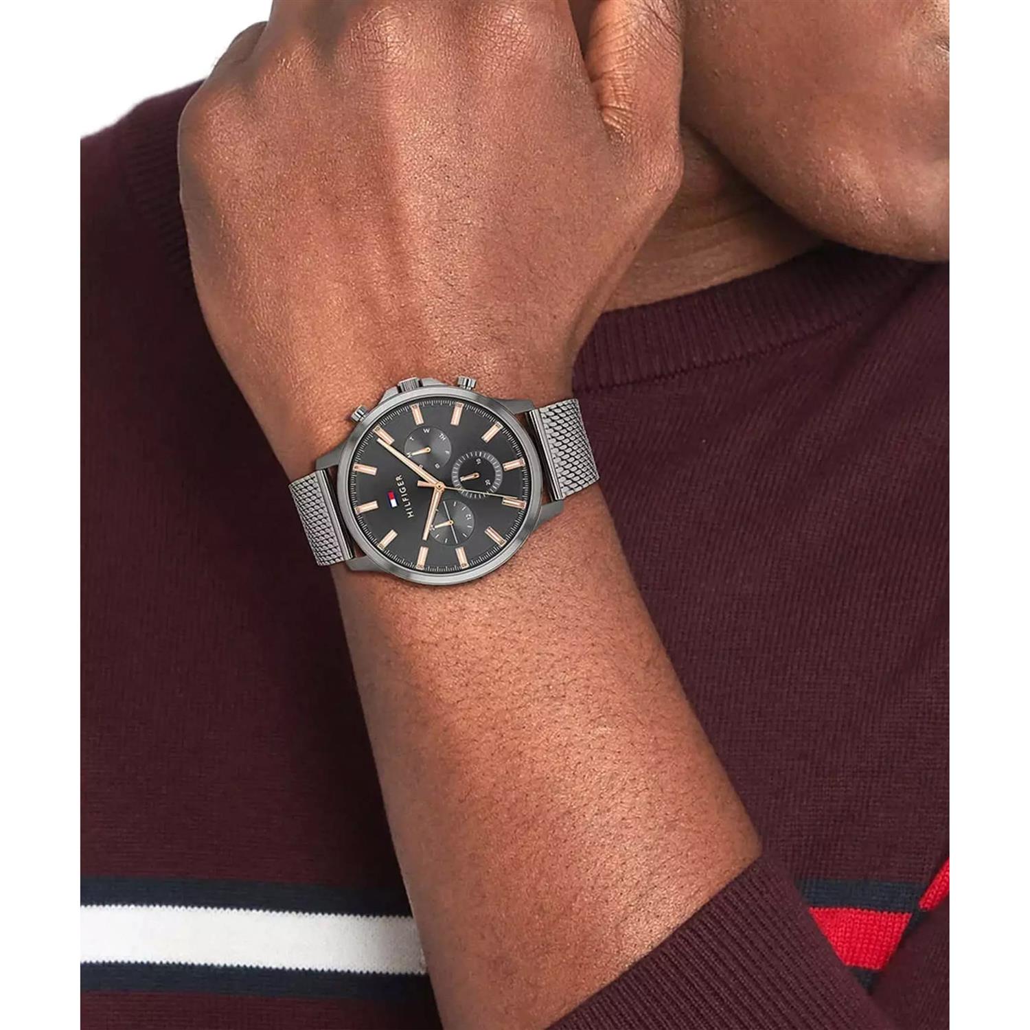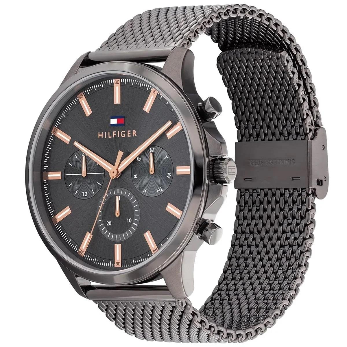 ساعت مچی مردانه تامی هیلفیگر Tommy Hilfiger با طراحی اسپرت بند حصیر بافت طوسی و قاب فلزی طوسی و صفحه گرد طوسی با قابلیت داشتن تقویم روزهای هفته روز و شب شب نما و موتور ژاپنی با انرژی باتری و مقاوم در برابر آب تا عمق 50 متر به همراه گارانتی بین المللی