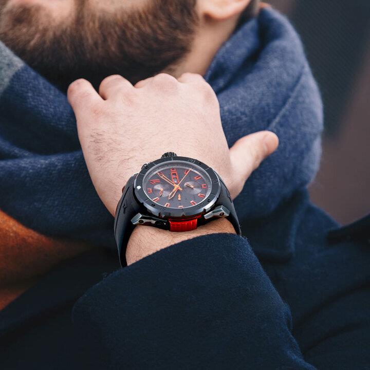 ساعت مچی مردانه ادکس edox با طراحی اسپرت بند سیلیکونی مشکی و قاب فلزی دودی نارنجی با صفحه گرد دودی با شیشه ضد خراش و قابلیت داشتن شب نما کرنوگراف تقویم زه تاچی متر روزهای هفته و موتور اتوماتیک سوییسی با انرژی مکانیکی و مقاوم در برابر آب تا عمق 500 متر به همراه دو سال گارانتی بین المللی