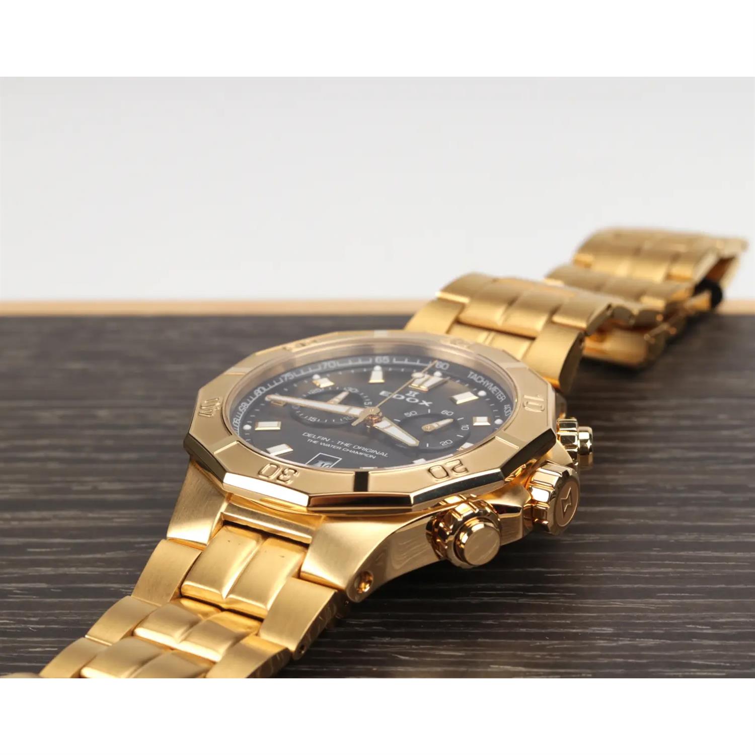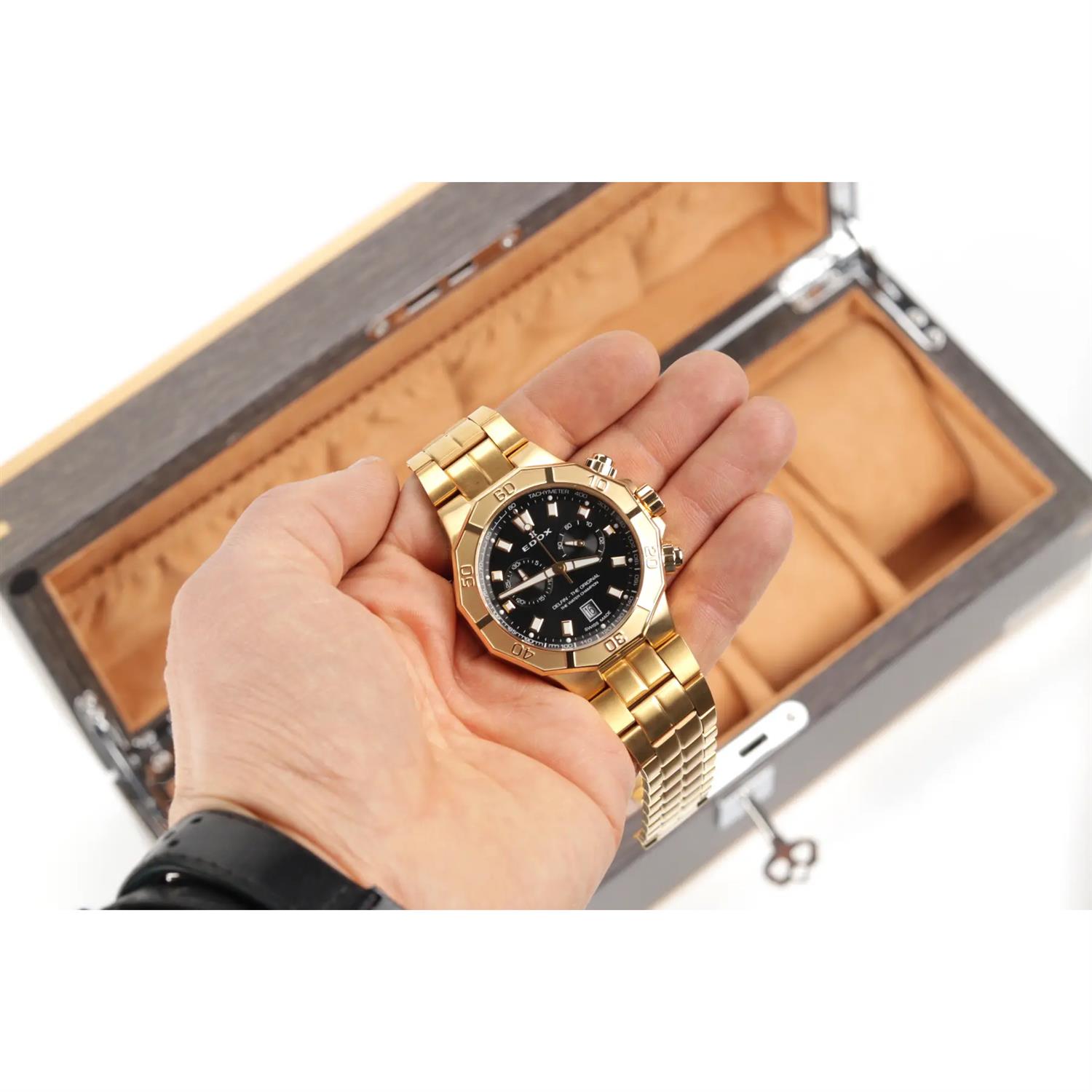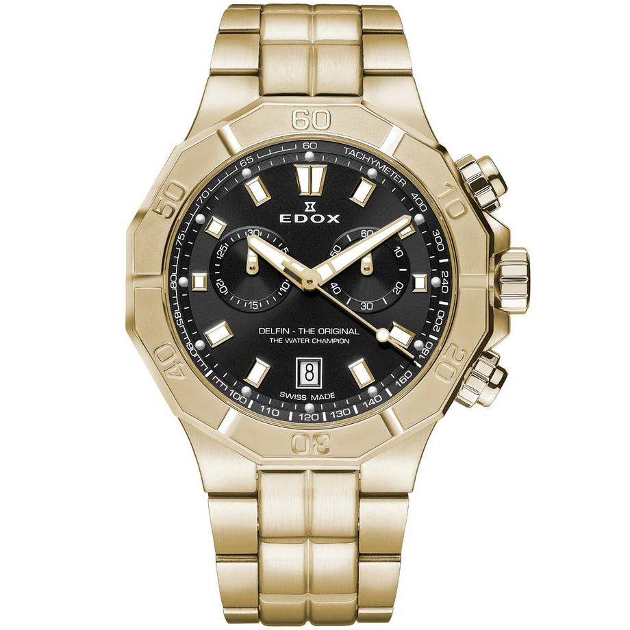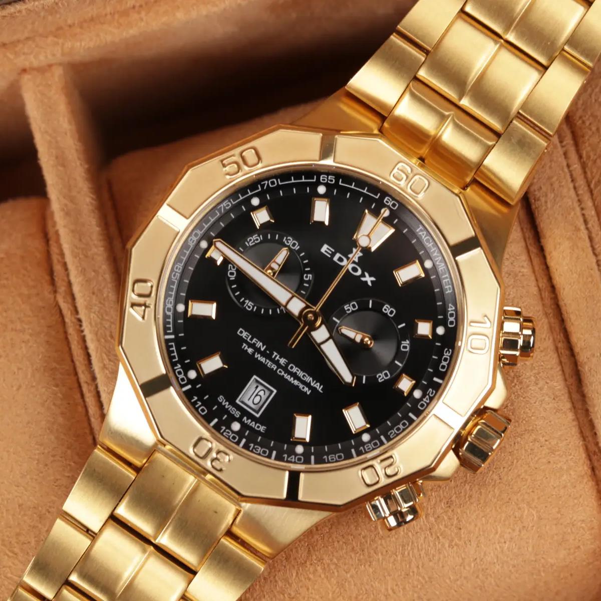 ساعت مچی مردانه ادکس edox با طراحی اسپرت بند فلزی طلایی و قاب فلزی طلایی با صفحه گرد مشکی با شیشه ضد خراش و قابلیت داشتن شب نما کرنوگراف تقویم زه تاچی متر و موتور سوییسی با انرژی باتری و مقاوم در برابر آب تا عمق 200 متر به همراه دو سال گارانتی بین المللی