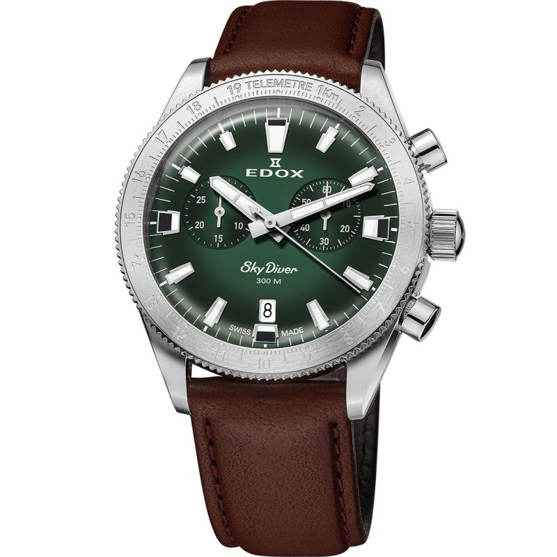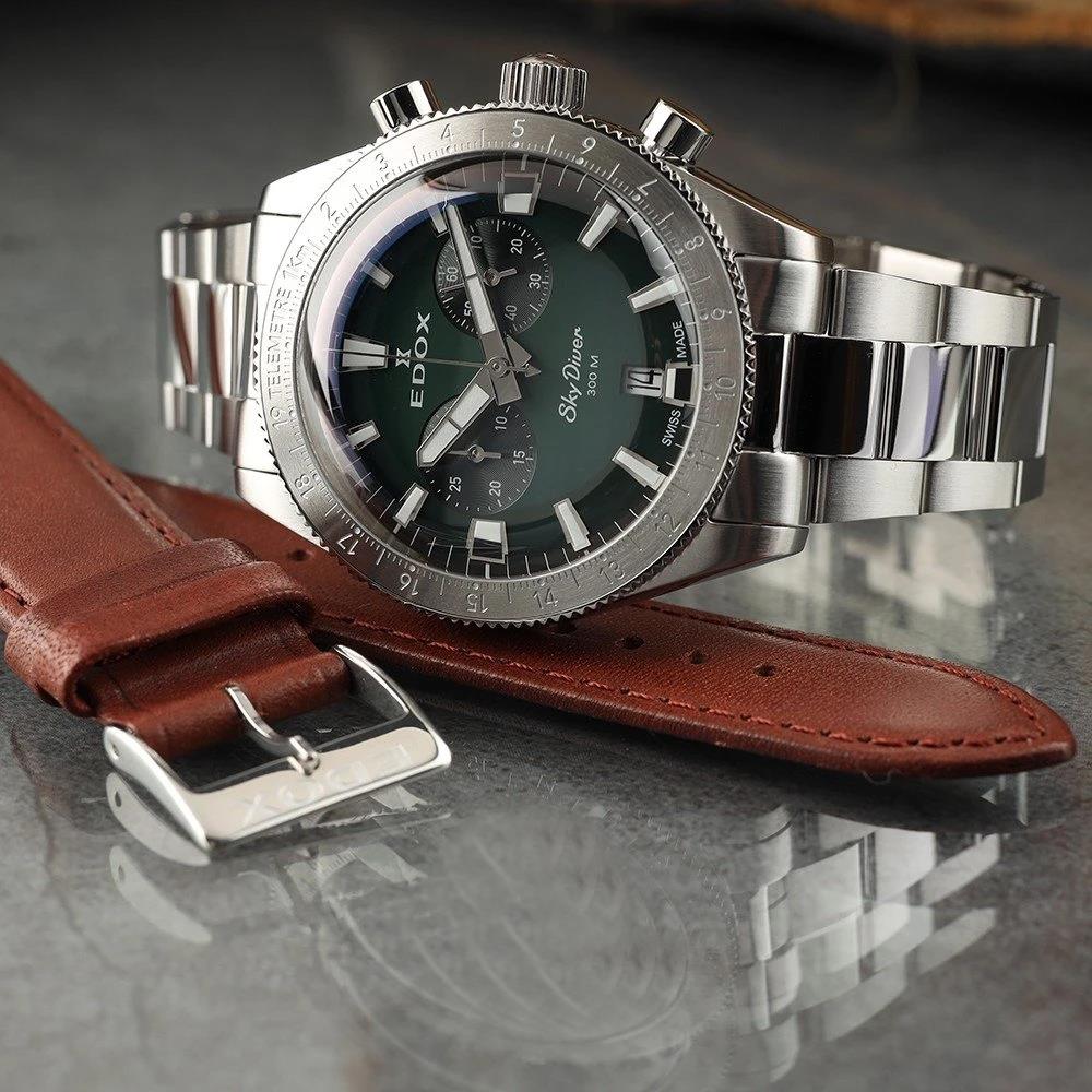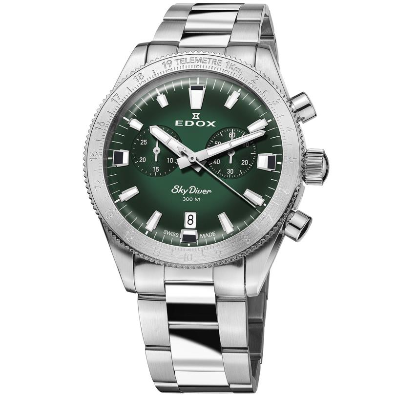 ساعت مچی مردانه ادکس edox با طراحی اسپرت بند استیل چرمی و قاب گرد استیل با صفحه گرد سبز با شیشه ضد خراش و قابلیت داشتن شب نما کرنوگراف تقویم زه تاچی متر زه چرخان موتور سوییسی با انرژی باتری و مقاوم در برابر آب تا عمق 300 متر به همراه دو سال گارانتی بین المللی