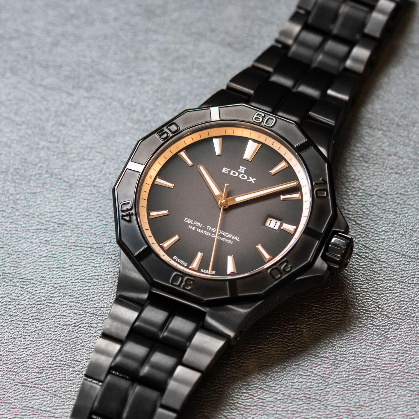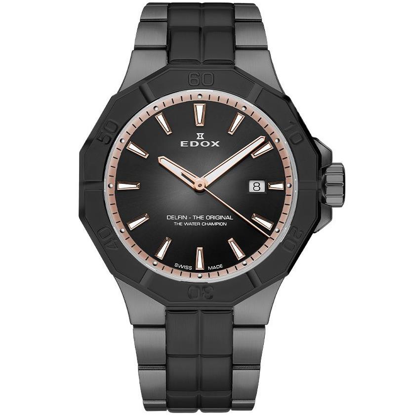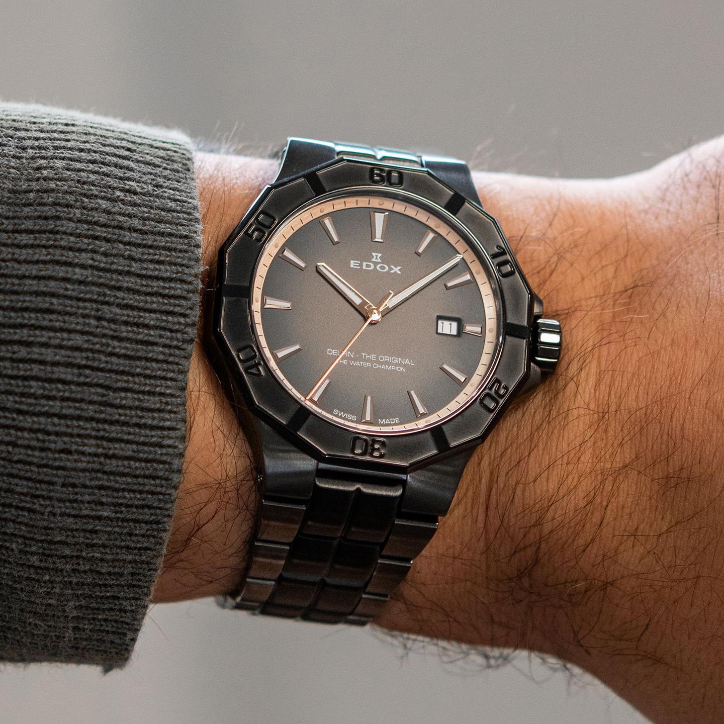 ساعت مچی مردانه ادکس edox با طراحی اسپرت بند فلزی دودی مشکی و قاب متفاوت مشکی  با صفحه گرد با شیشه ضد خراش و قابلیت داشتن شب نما تقویم و موتور سوییسی با انرژی باتری و مقاوم در برابر آب تا عمق 200 متر به همراه دو سال گارانتی بین المللی