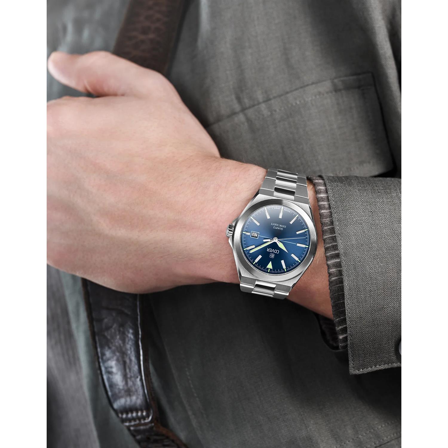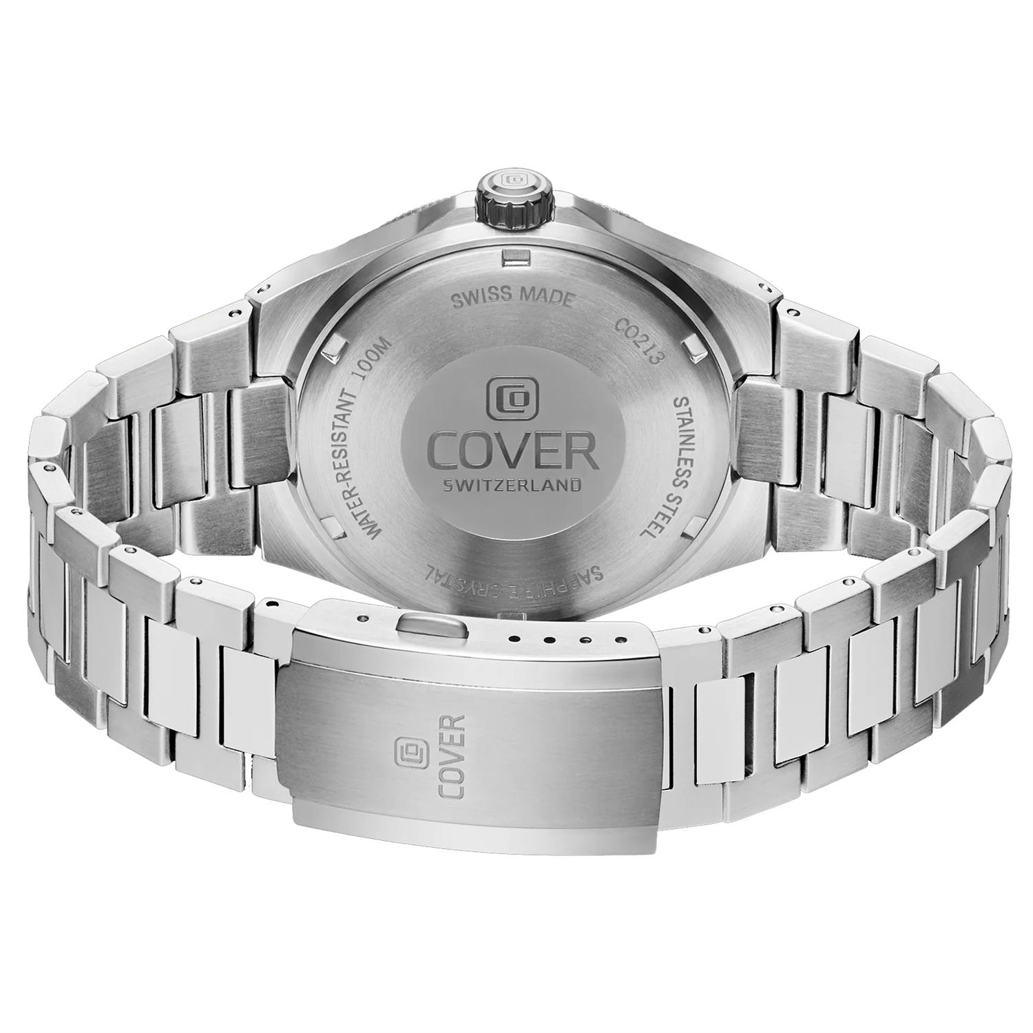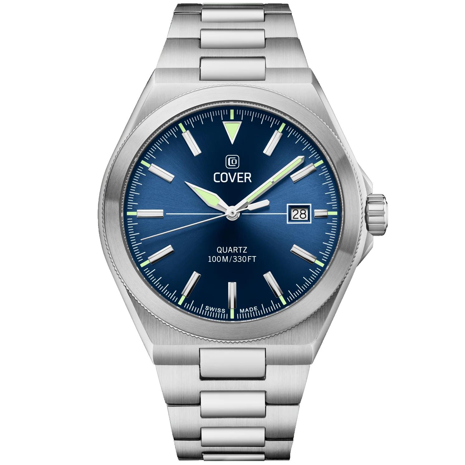 ساعت مچی مردانه کاور COVER با طراحی کلاسیک بند استیل با قاب گرد استیل و صفحه گرد سرمه ای با شیشه ضد خراش و موتورسوییسی با انرژی باتری و قابلیت داشتن تقویم / شب نما و مقاوم در برابر آب تا عمق 100 متربه همراه دو سال گارانتی بین المللی
