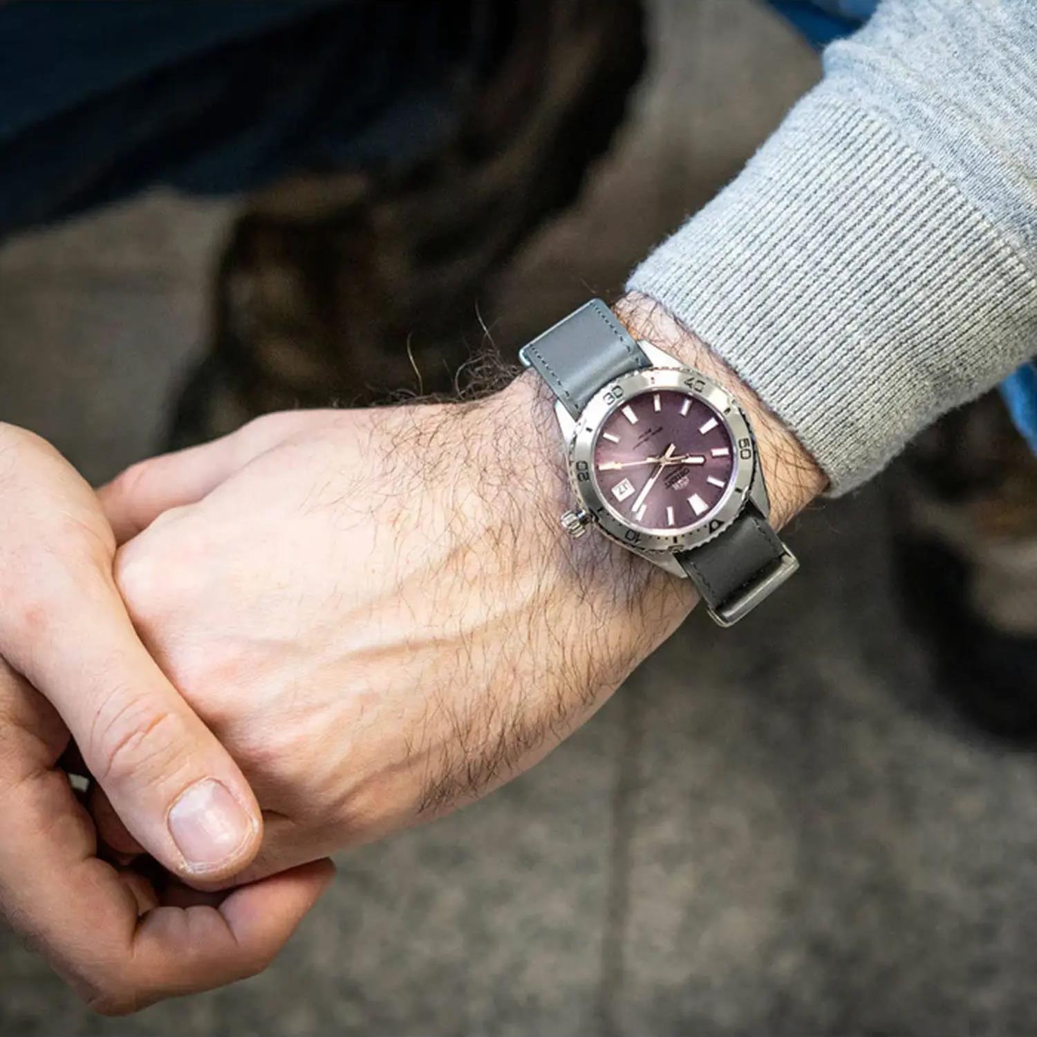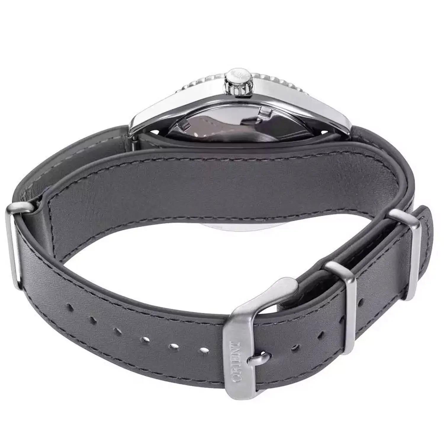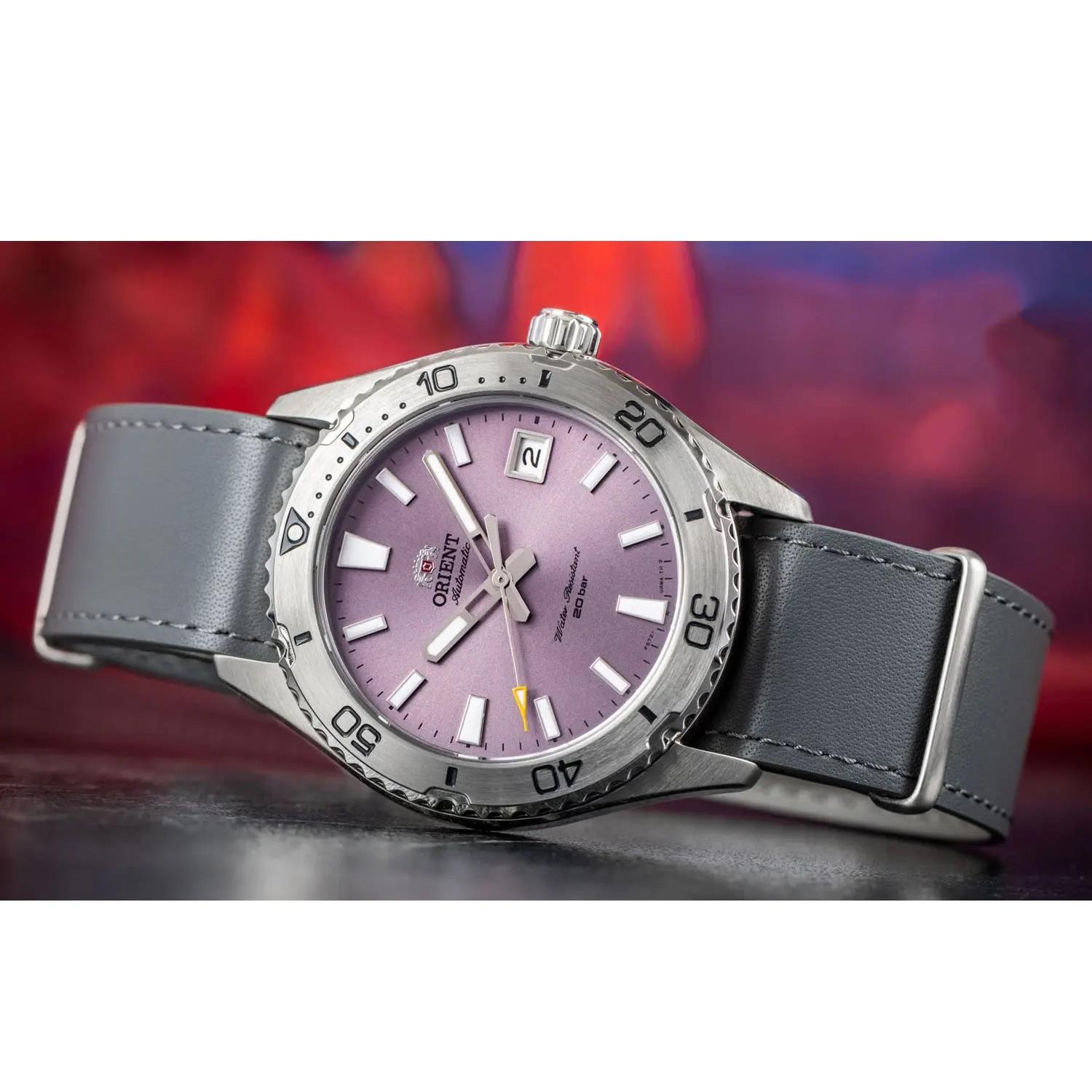 ساعت مچی مردانه اورینت orient با طراحی روزانه بند چرمی طوسی و قاب استیل و صفحه گرد بنفش با شیشه ضد خراش و قابلیت داشتن تقویم شب نما زه چرخان و موتوراتوماتیک ژاپنی با انرژی مکانیکی و مقاومت در برابر آب تا عمق 200 متر به همراه  گارانتی بین المللی