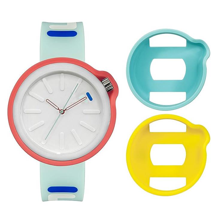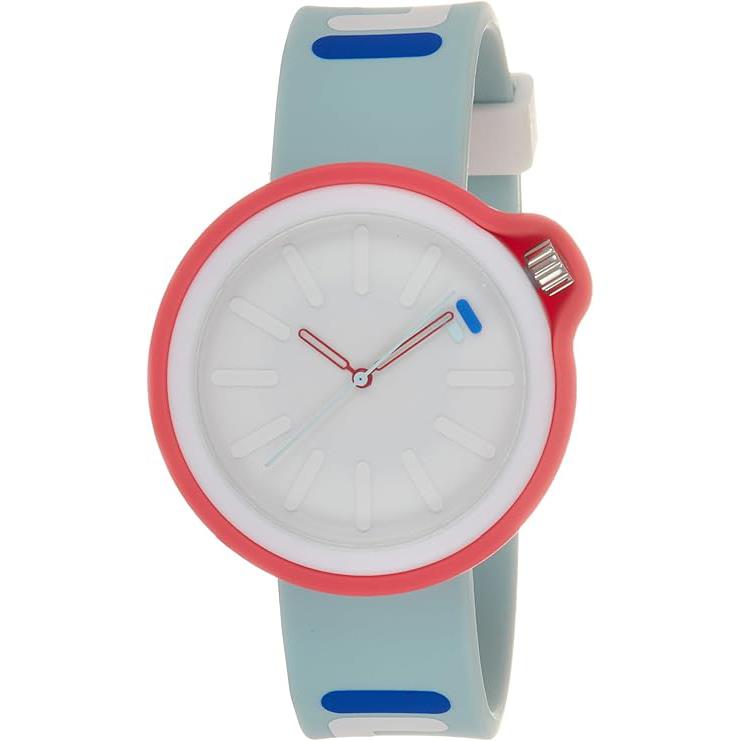 ساعت مچی پسرانه/دخترانه فیلا FILA با طراحی اسپرت با بند سیلیکونی آبی و قاب گرد قرمز زرد آبی و صفحه گرد سفید و موتور ژاپنی با انرژی باتری و مقاومت در برابر اب تا عمق 50 متر به همراه  گارانتی بین المللی