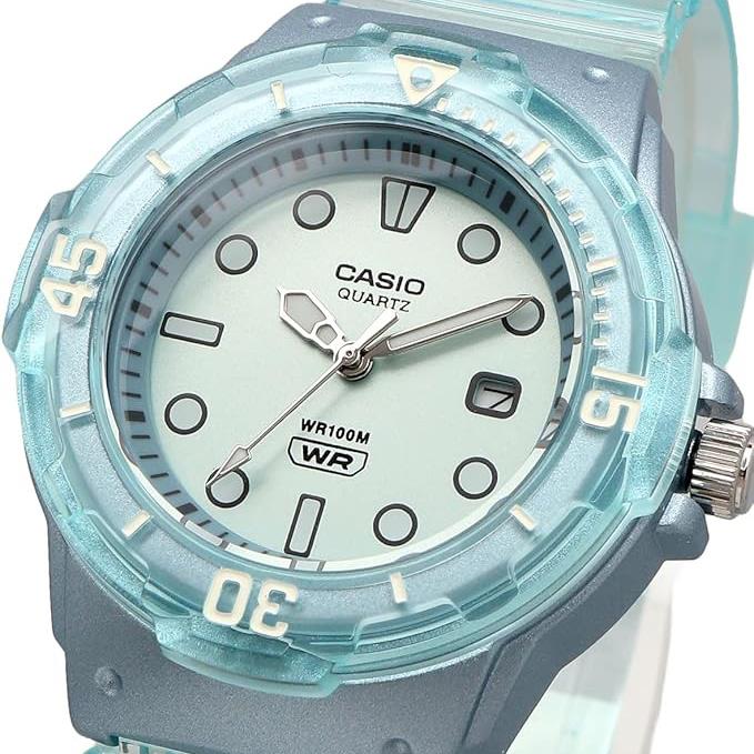 ساعت مچی زنانه کاسیو casio با طراحی اسپرت بند سیلیکونی آبی با قاب گرد آبی و صفحه گرد آبی با قابلیت داشتن تقویم شب نما و موتور ژاپنی با انرژی باتری و مقاوم در برابر آب تا عمق 100 متر به همراه گارانتی بین المللی