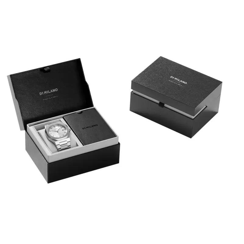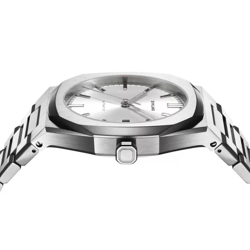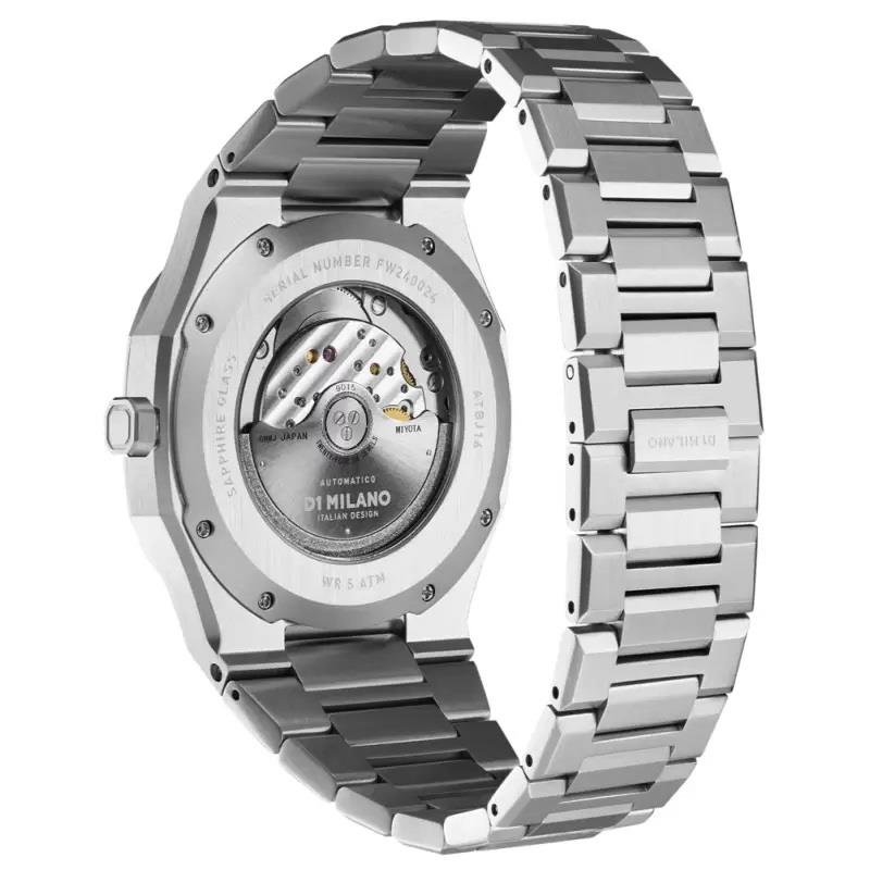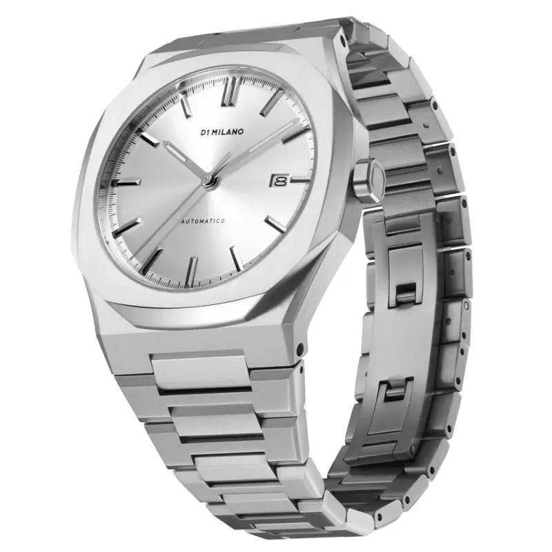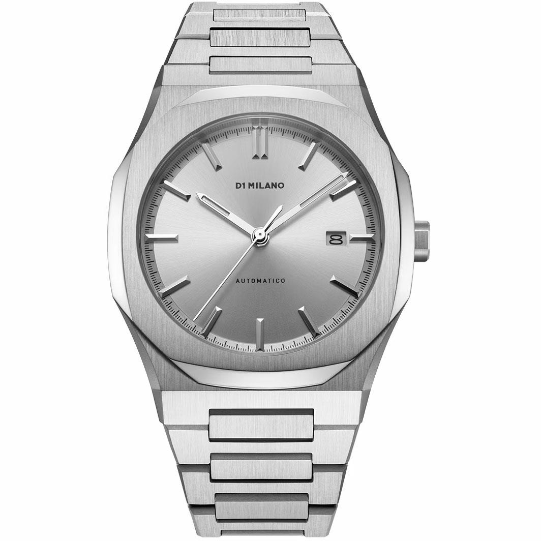 ساعت مچی مردانه دی وان میلانوd1milano با طراحی روزانه بند استیل و قاب متفاوت استیل و صفحه گرد نقره ای با موتور اتوماتیک ژاپنی با انرژی مکانیکی و مقاومت در برابر آب تا عمق 50 متر به همراه گارانتی بین المللی