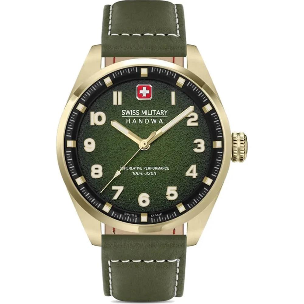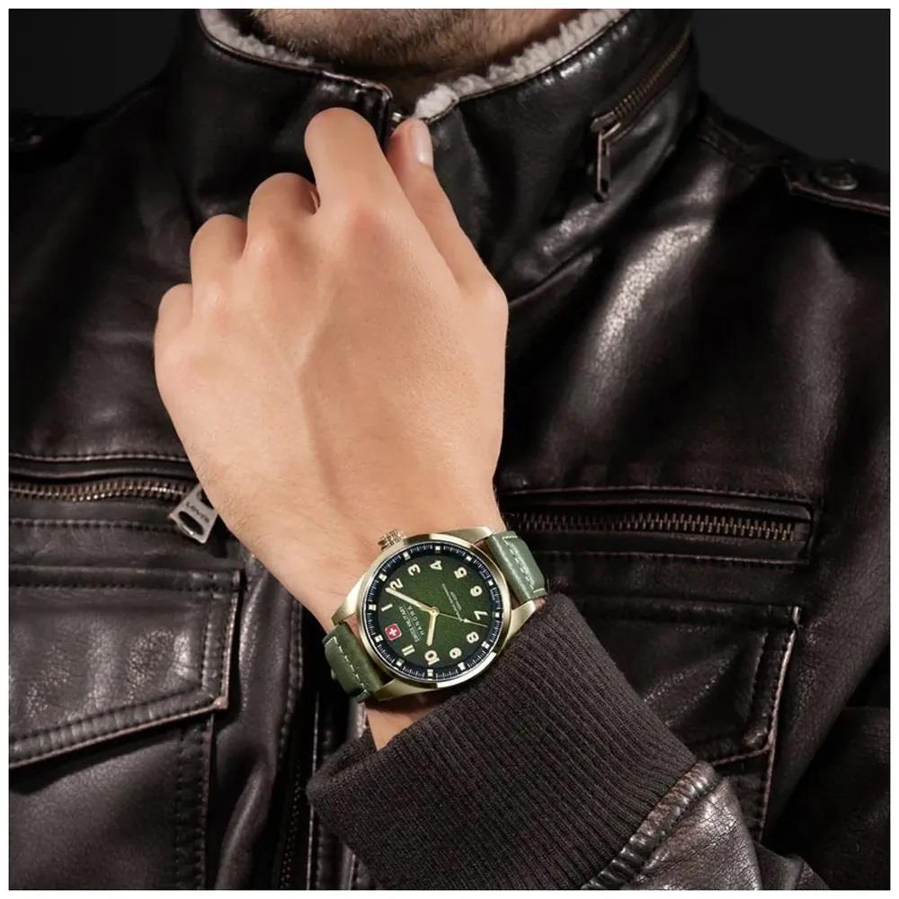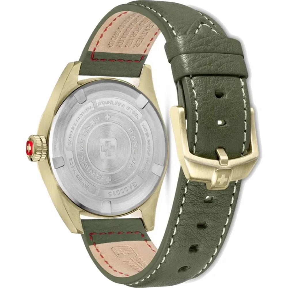 ساعت مچی مردانه سوییس میلیتاریswiss military با طراحی اسپرت بند چرمی سبز با قاب فلزی طلایی و صفحه گرد سبز با شیشه ضد خراش و قابلیت داشتن شب نما و موتور سوییسی با انرژی باتری و مقاوم در برابر آب تا عمق 100 متر به همراه گارانتی بین المللی