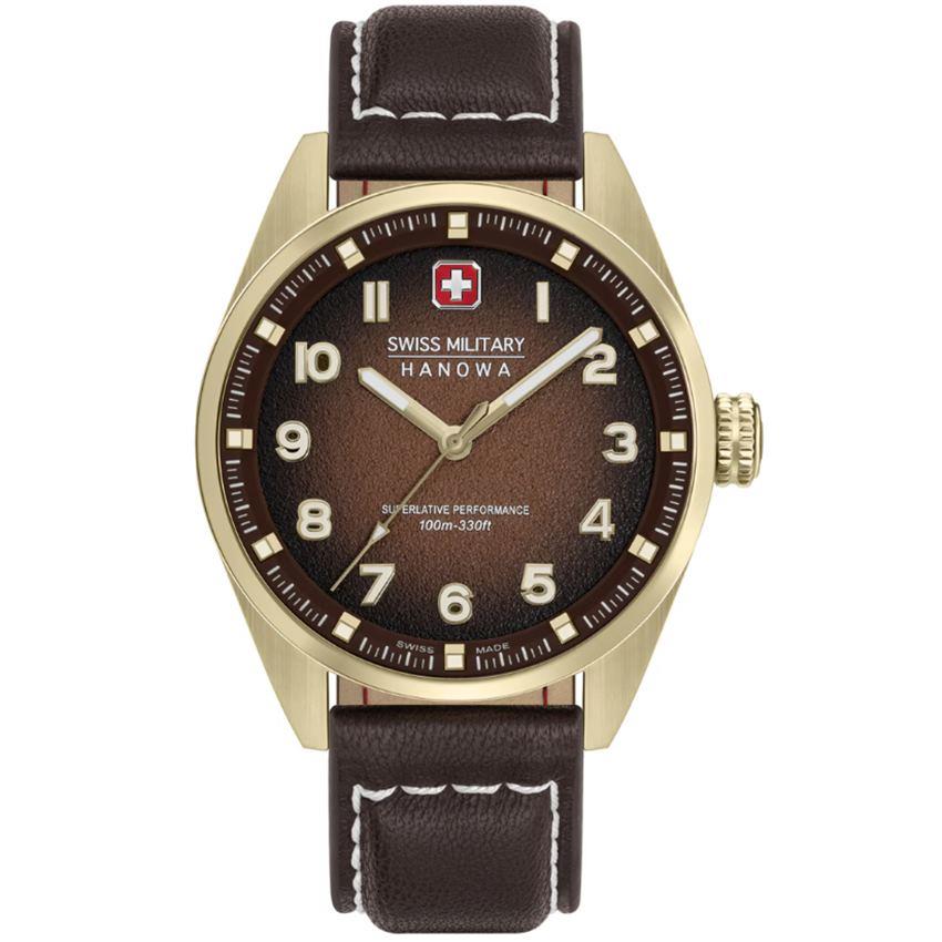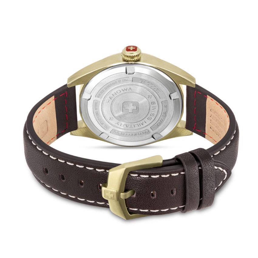 ساعت مچی مردانه سوییس میلیتاریswiss military با طراحی اسپرت بند چرمی قهوه ای با قاب فلزی طلایی و صفحه گرد قهوه ای با شیشه ضد خراش و قابلیت داشتن شب نما  و موتور سوییسی با انرژی باتری و مقاوم در برابر آب تا عمق 100 متر به همراه گارانتی بین المللی