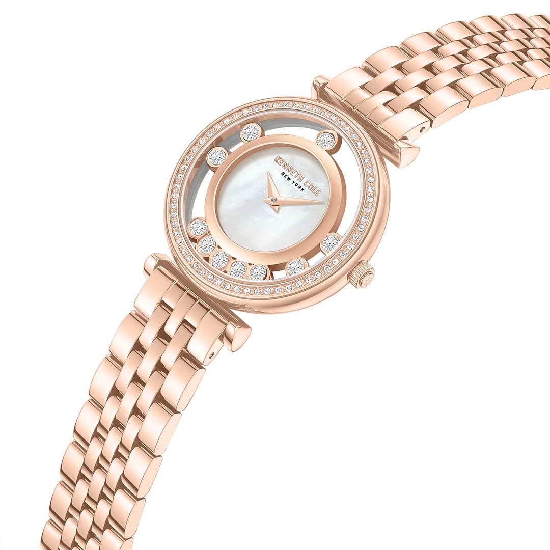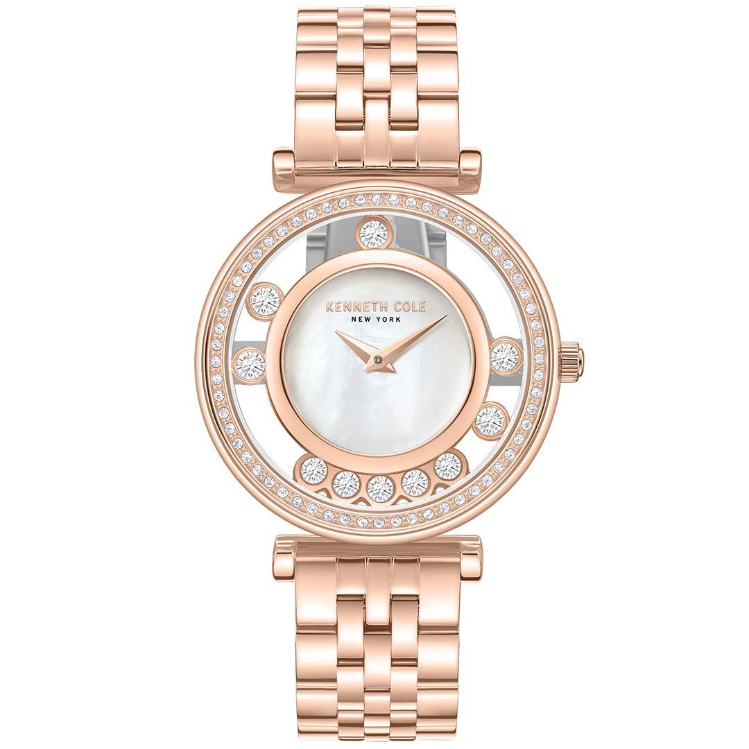 ساعت مچی زنانه کنت کول kenneth cole با طراحی روزانه بند فلزی مسی , قاب دورنگین مسی  و صفحه نگین دار سفید صدفی و موتور ژاپنی با انرژی باتری و مقاومت در برابر آب تا عمق 30 متر به همراه دو سال گارانتی بین المللی