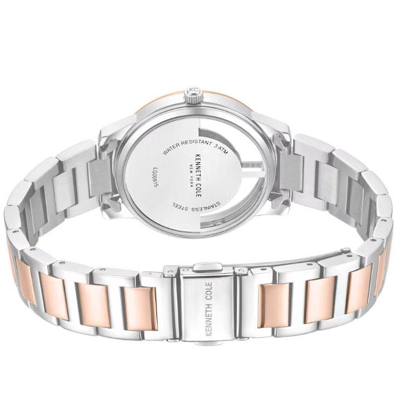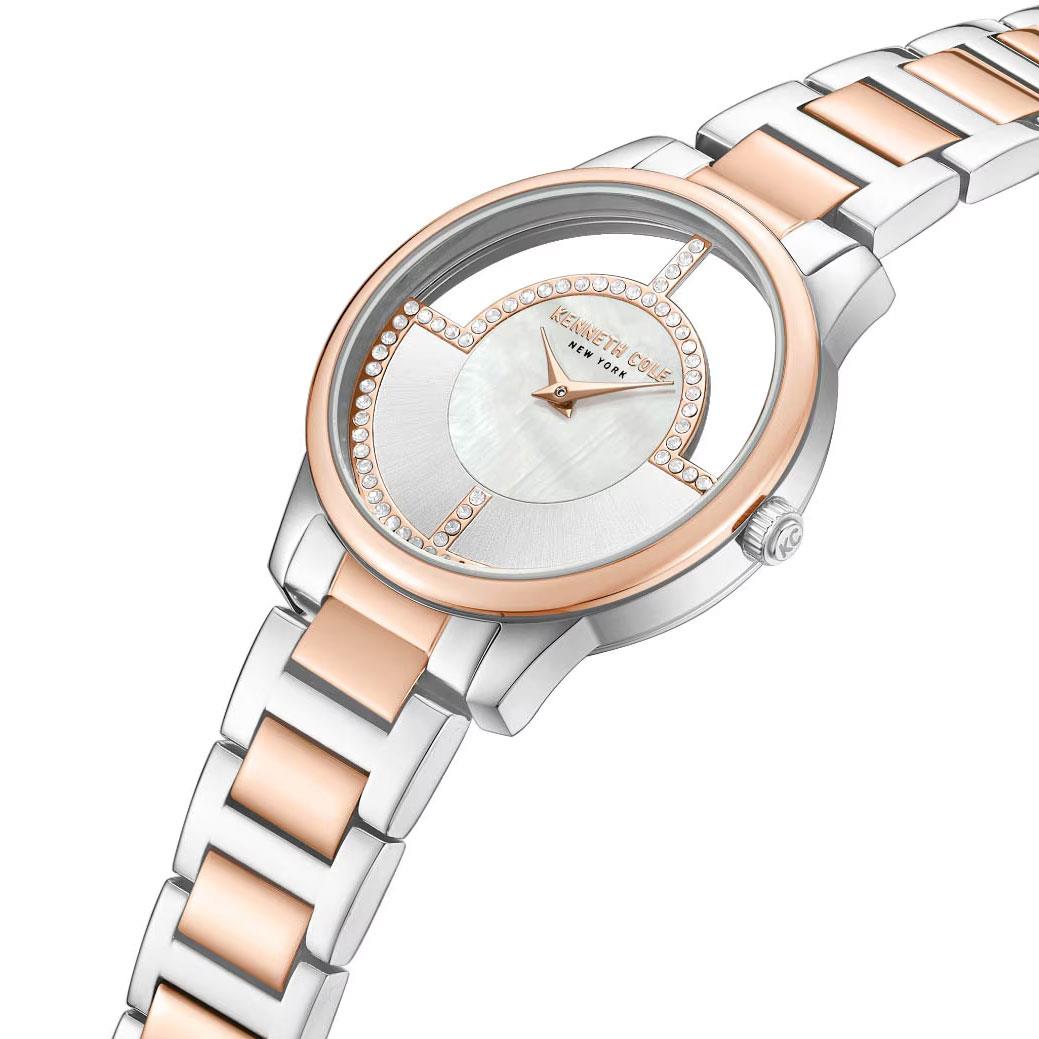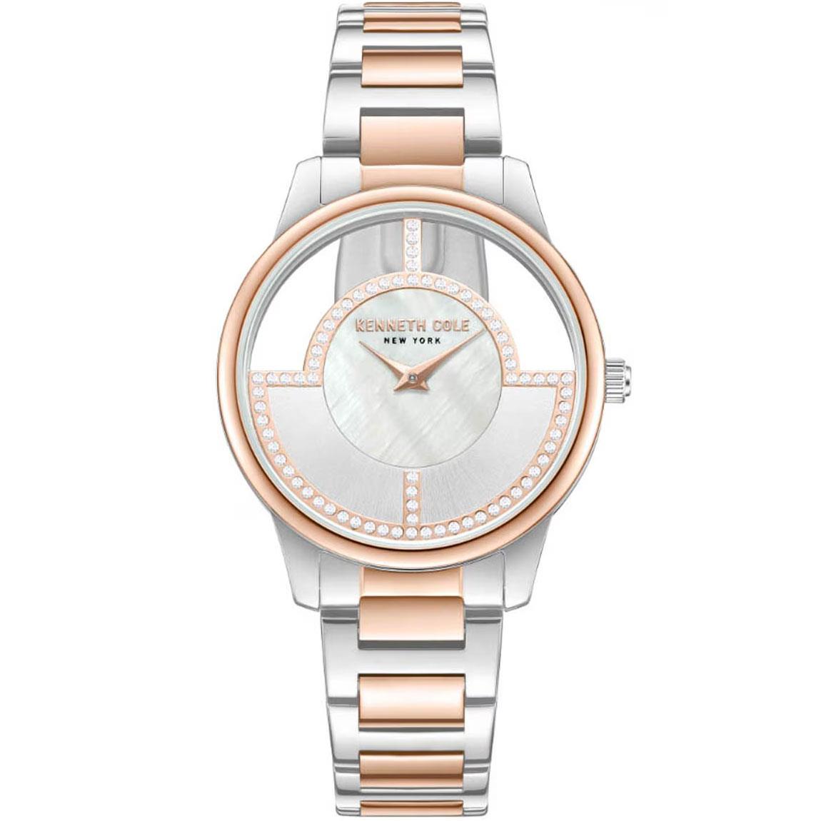 ساعت مچی زنانه کنت کول kenneth cole با طراحی روزانه بند استیل مسی, قاب مسی استیل و صفحه نگین دار سفید مسی و موتور ژاپنی با انرژی باتری و مقاومت در برابر آب تا عمق 30 متر به همراه دو سال گارانتی بین المللی