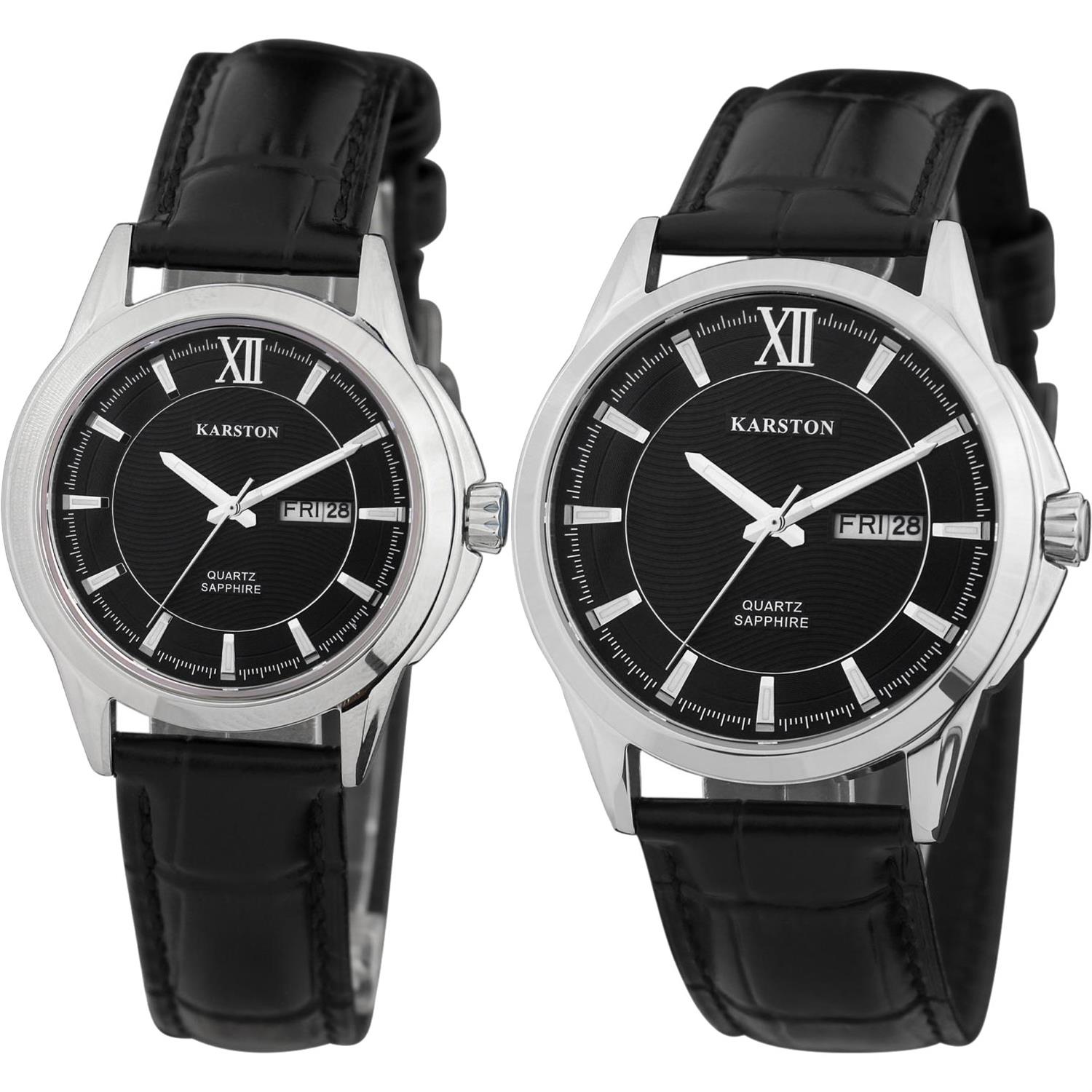 ساعت مچی مردانه / زنانه کارستون karston با طراحی روزانه بند چرمی و قاب استیل و صفحه گرد مشکی با شیشه ضد خراش و قابلیت داشتن تقویم روزهای هفته شب نما و موتور ژاپنی با انرژِی باتری و مقاوم در برابر آب تا عمق 30 متر به همراه گارانتی بین المللی