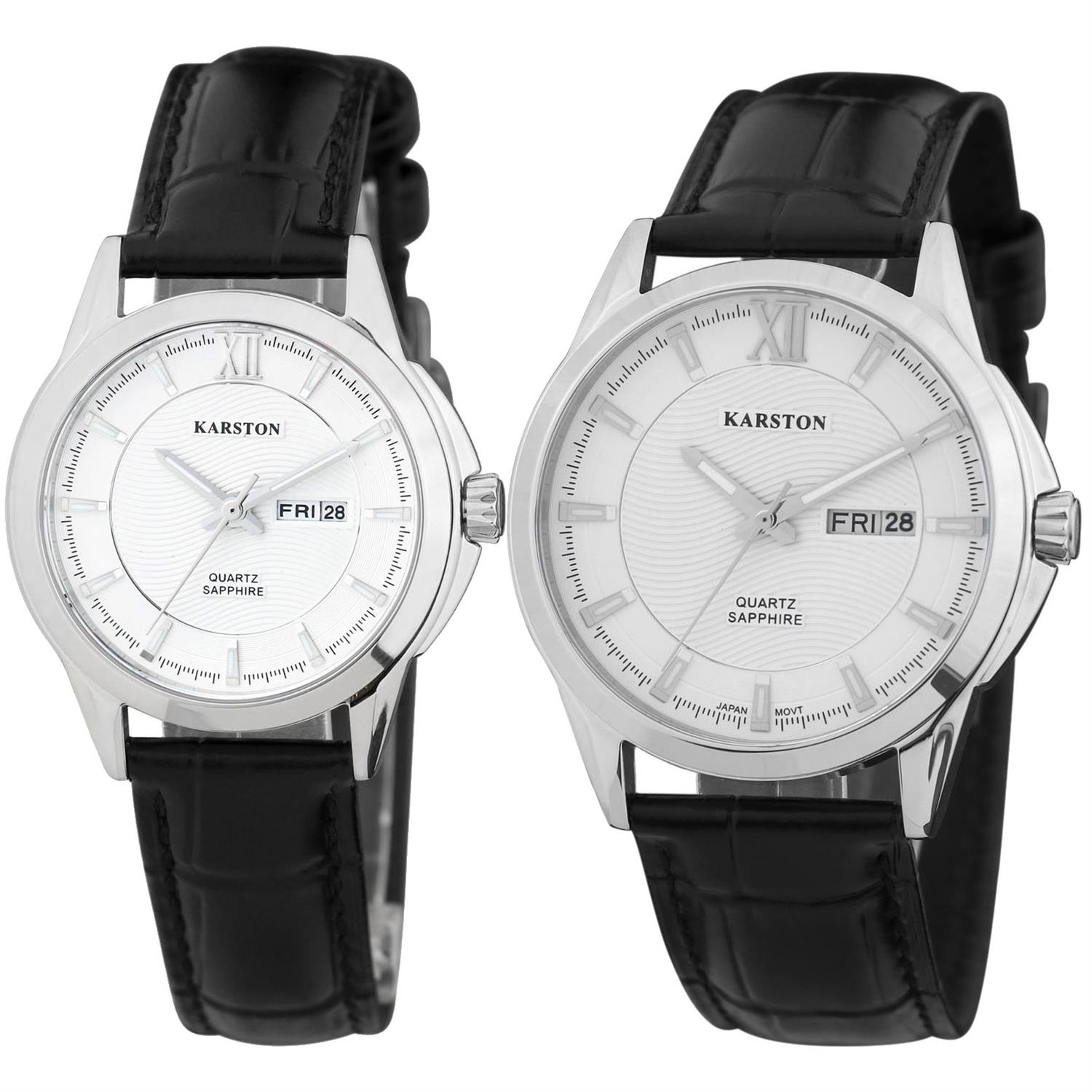 ساعت مچی مردانه / زنانه کارستون karston با طراحی روزانه بند چرمی و قاب استیل و صفحه گرد نقره ای با شیشه ضد خراش و قابلیت داشتن تقویم روزهای هفته شب نما و موتور ژاپنی با انرژِی باتری و مقاوم در برابر آب تا عمق 30 متر به همراه گارانتی بین المللی