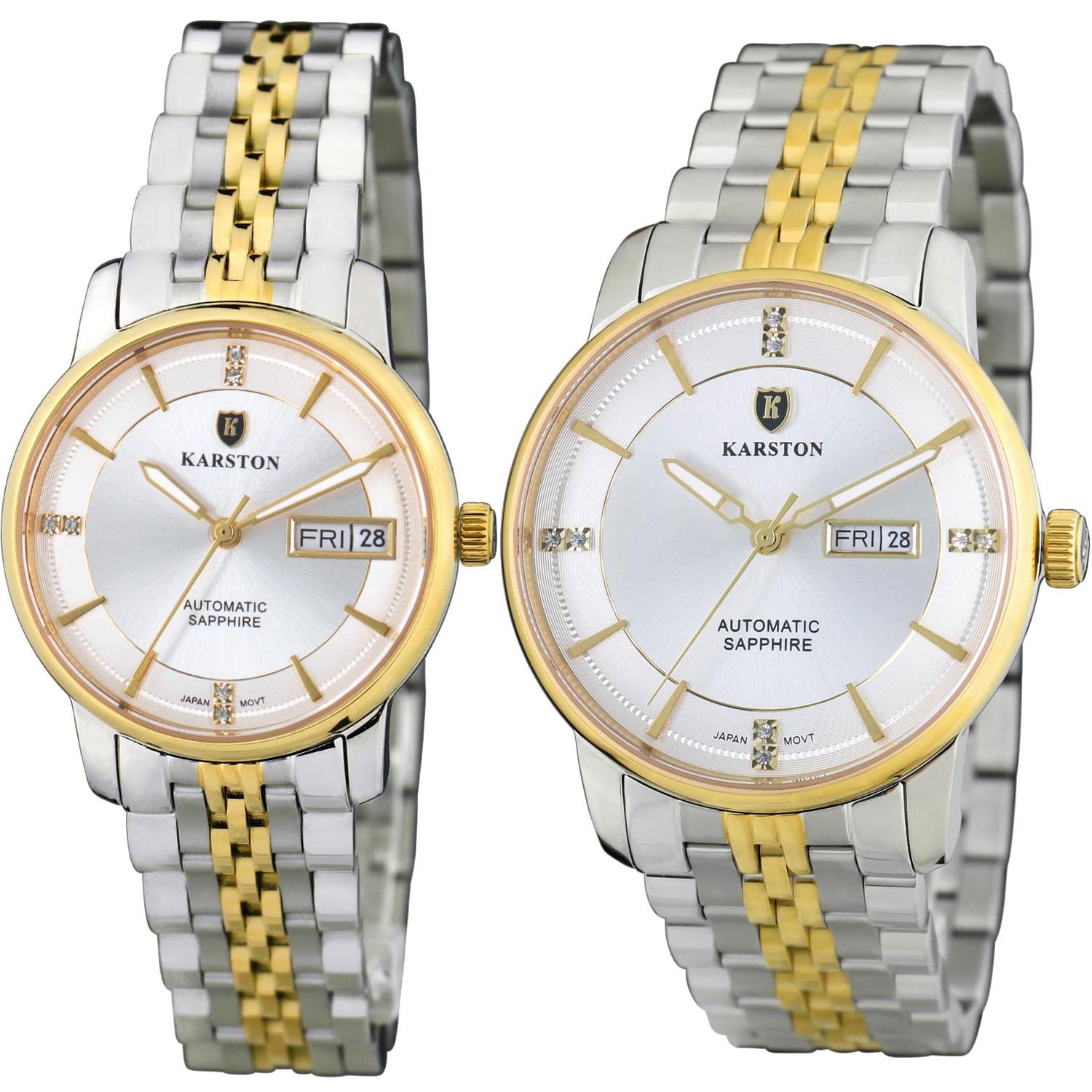 ساعت مچی مردانه / زنانه کارستون karston با طراحی روزانه بند استیل طلایی و قاب استیل طلایی و صفحه گرد نقره ای مزین به نگین  با شیشه ضد خراش و قابلیت داشتن تقویم روزهای هفته شب نما و موتوراتوماتیک  ژاپنی با انرژِی مکانیکی و مقاوم در برابر آب تا عمق 30متر به همراه گارانتی بین المللی