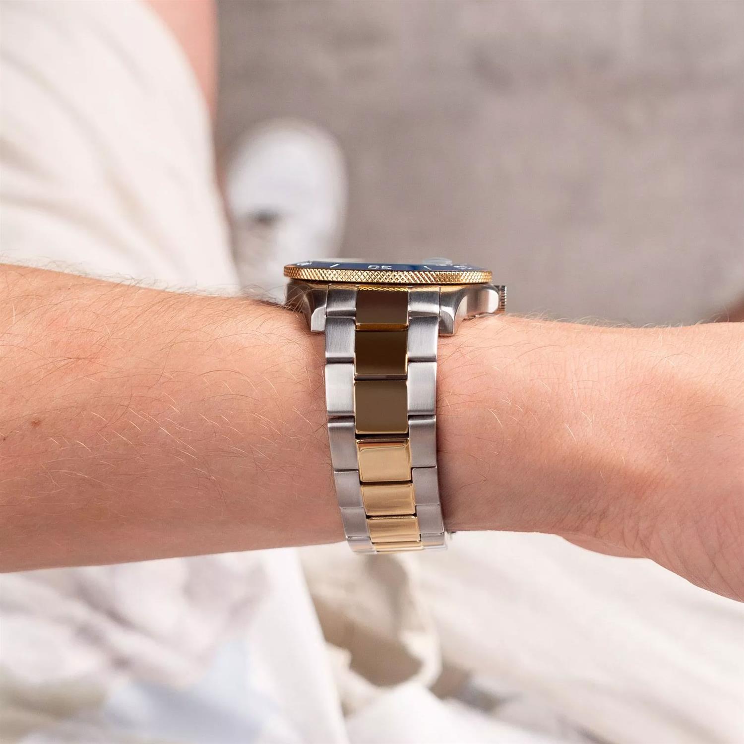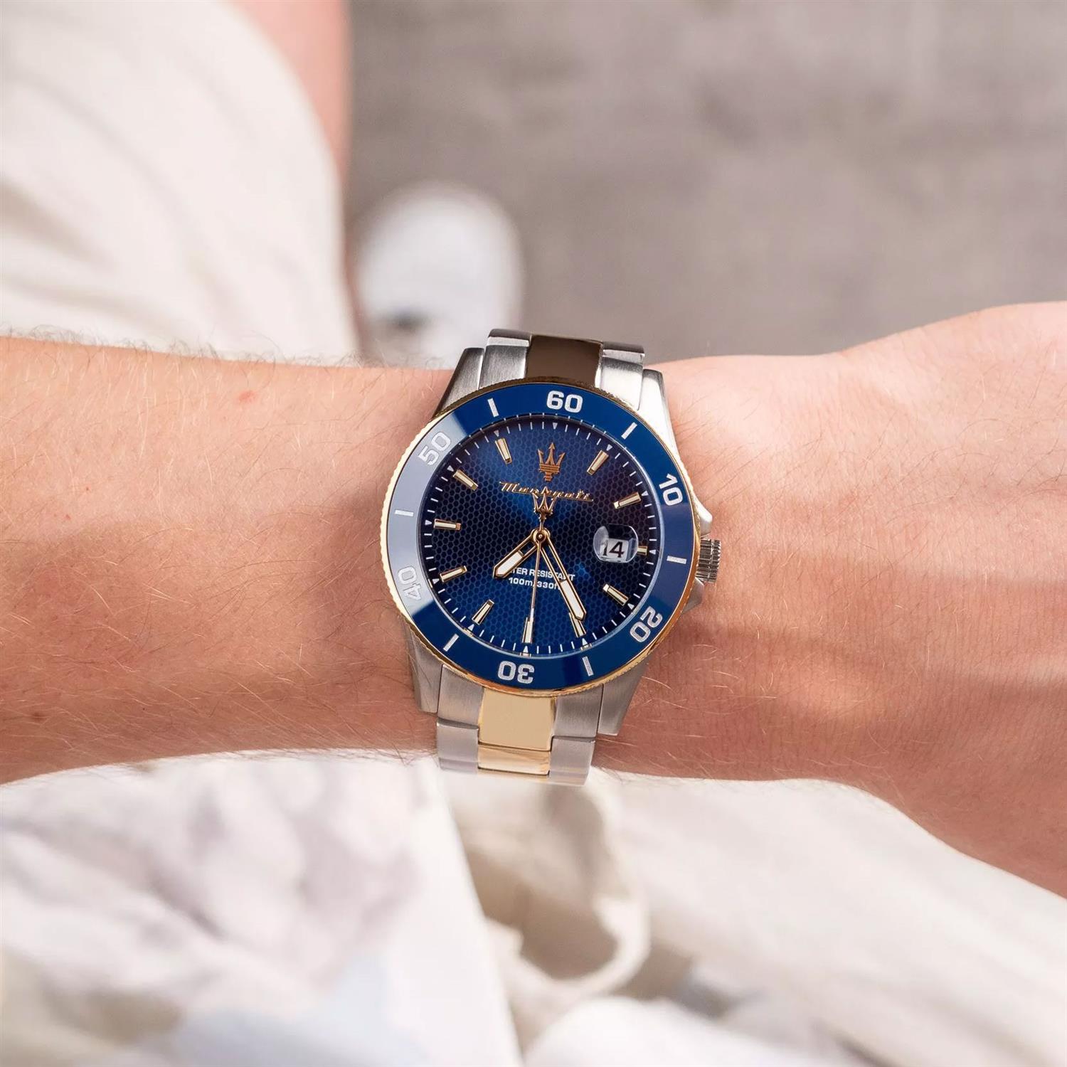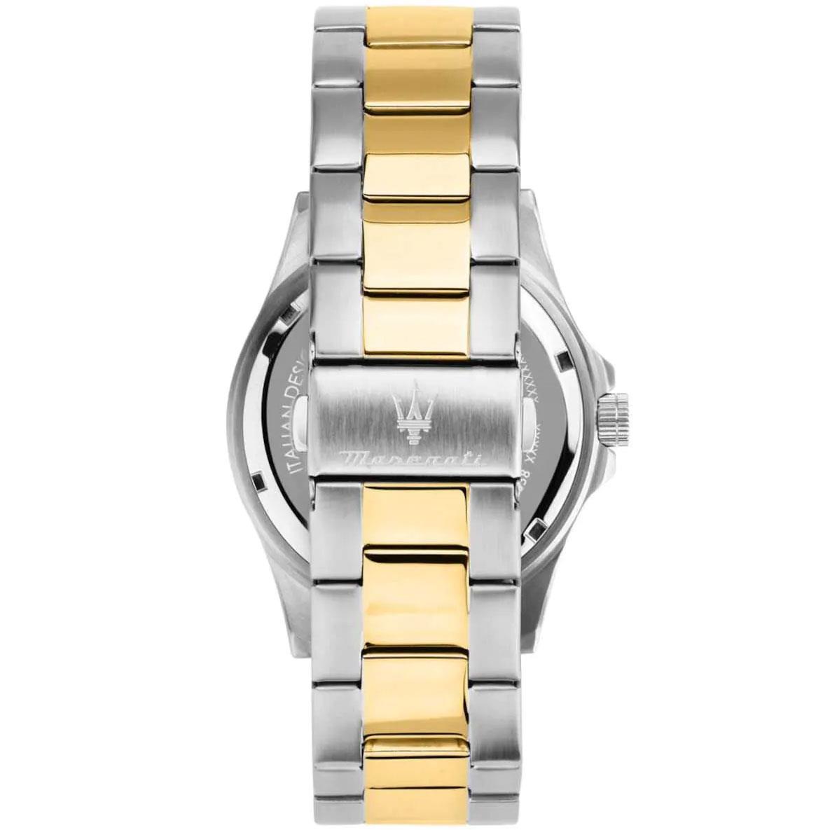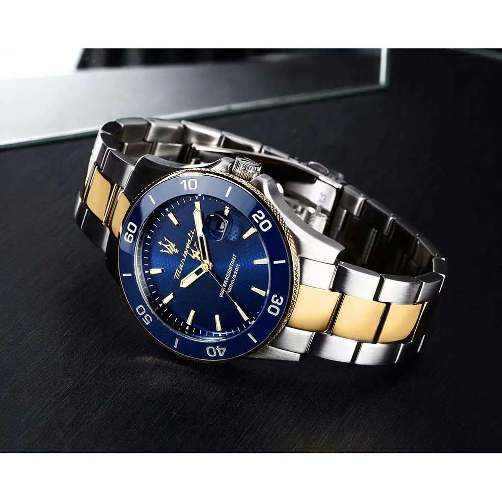 ساعت مچی مردانه مازراتی maserati با طراحی روزانه بند استیل طلایی و قاب گرد استیل طلایی سرمه ای و صفحه گرد سرمه ای  و قابلیت داشتن زه چرخان شب نما تقویم با موتور ژاپنی و انرژی باتری و مقاوم در برابر آب تا عمق 100 متر به همراه گارانتی بین المللی
