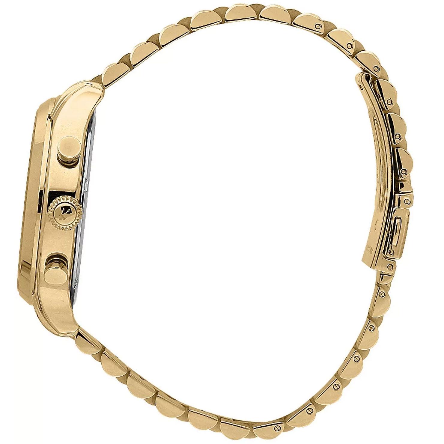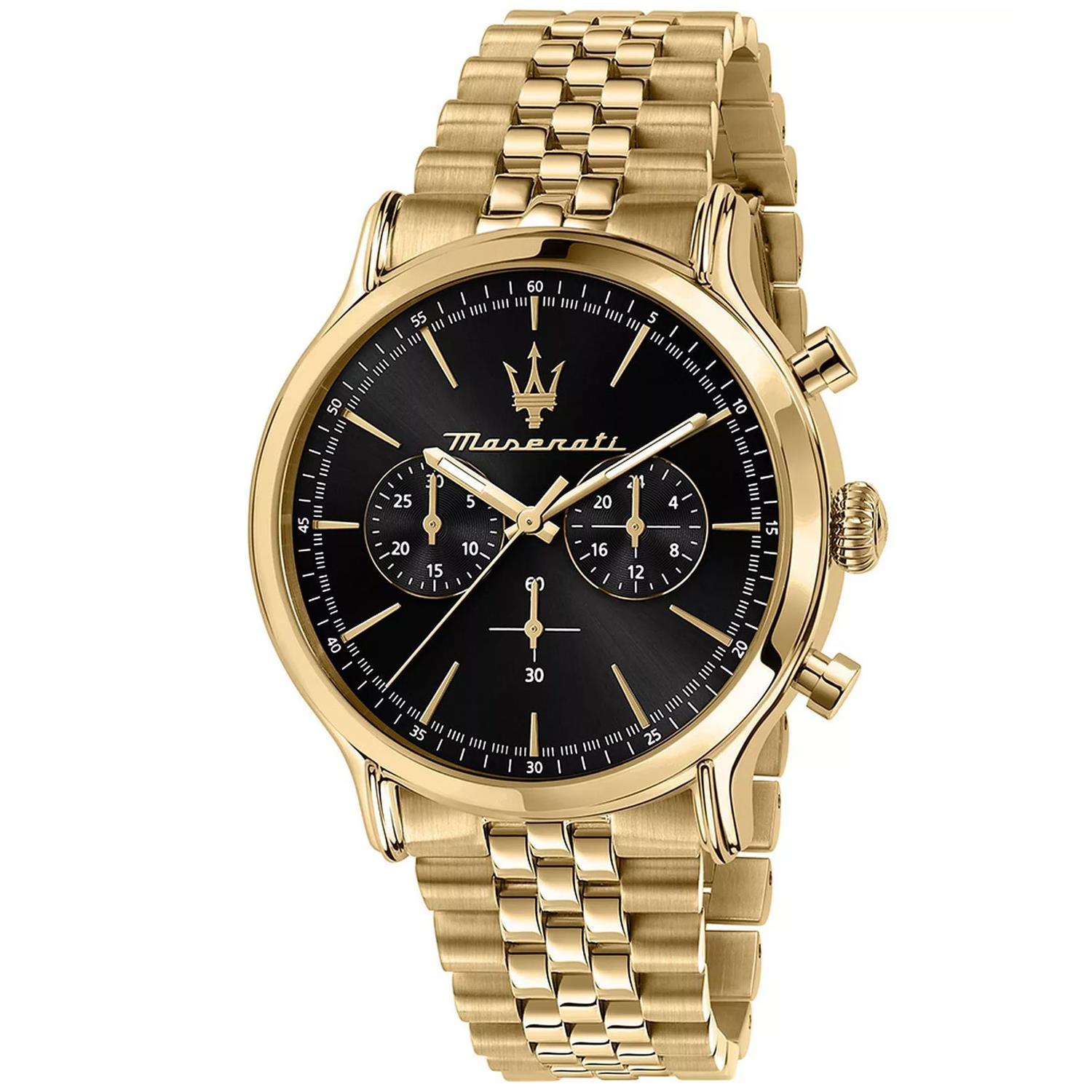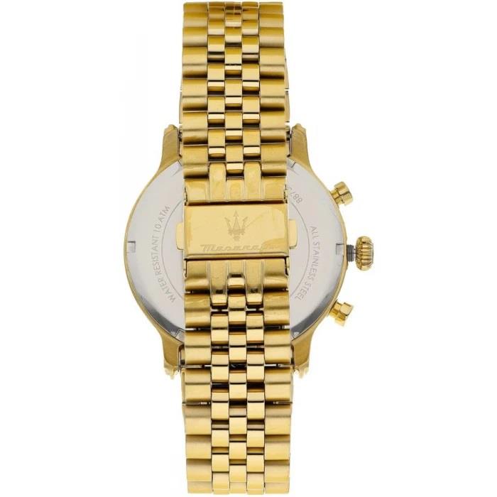 ساعت مچی مردانه مازراتی maserati با طراحی کلاسیک بند فلزی طلایی و قاب گرد فلزی طلایی و صفحه گرد مشکی و قابلیت داشتن کرنوگراف شب نما با موتور ژاپنی و انرژی باتری و مقاوم در برابر آب تا عمق 100 متر به همراه گارانتی بین المللی