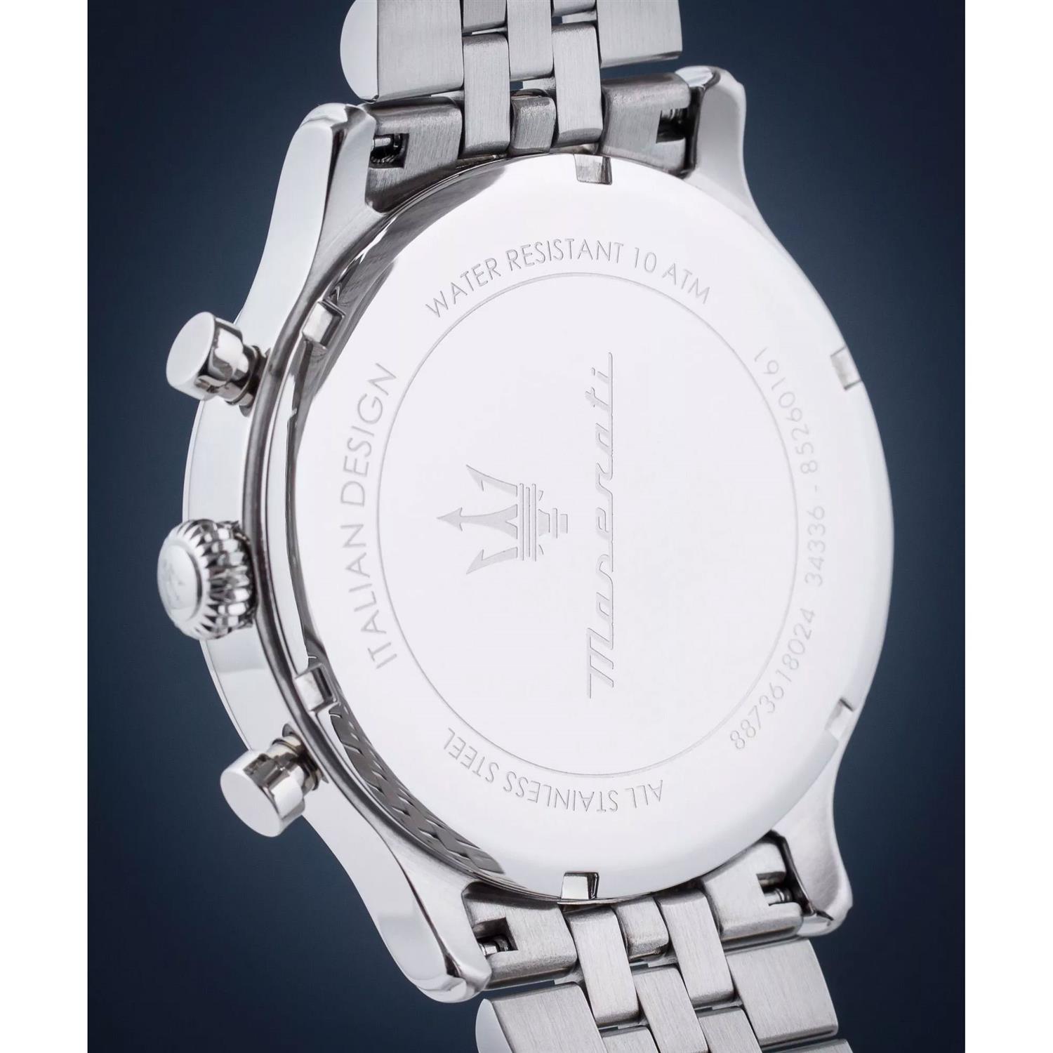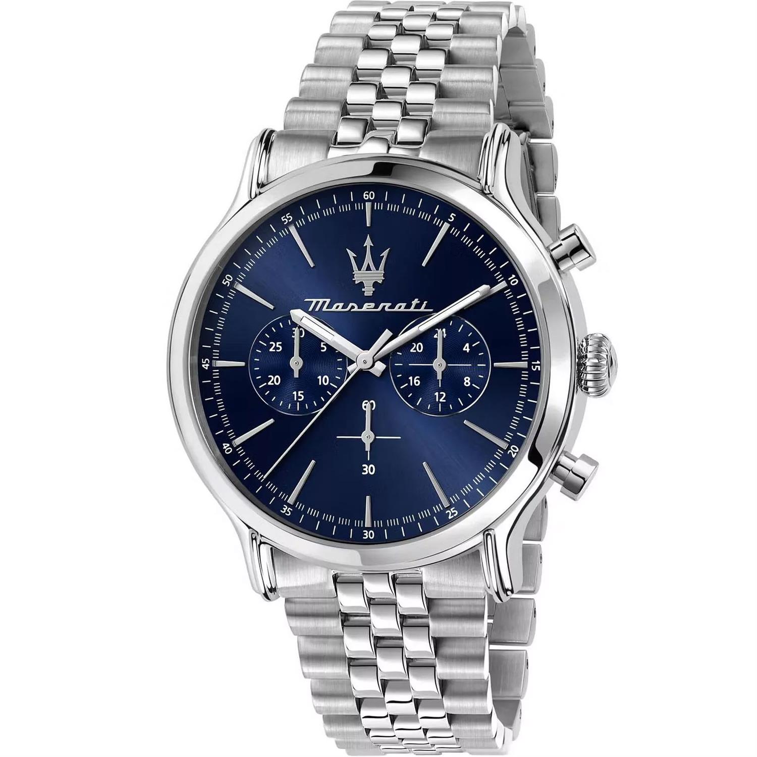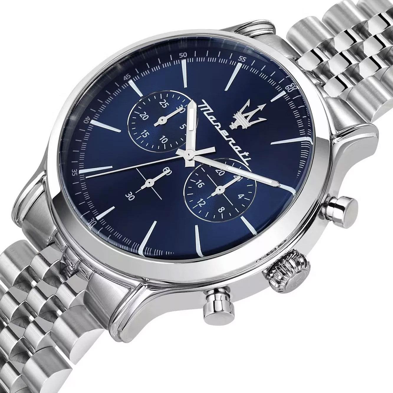 ساعت مچی مردانه مازراتی maserati با طراحی کلاسیک بند استیل و قاب گرد استیل و صفحه گرد سرمه ای و قابلیت داشتن کرنوگراف شب نما با موتور ژاپنی و انرژی باتری و مقاوم در برابر آب تا عمق 100 متر به همراه گارانتی بین المللی