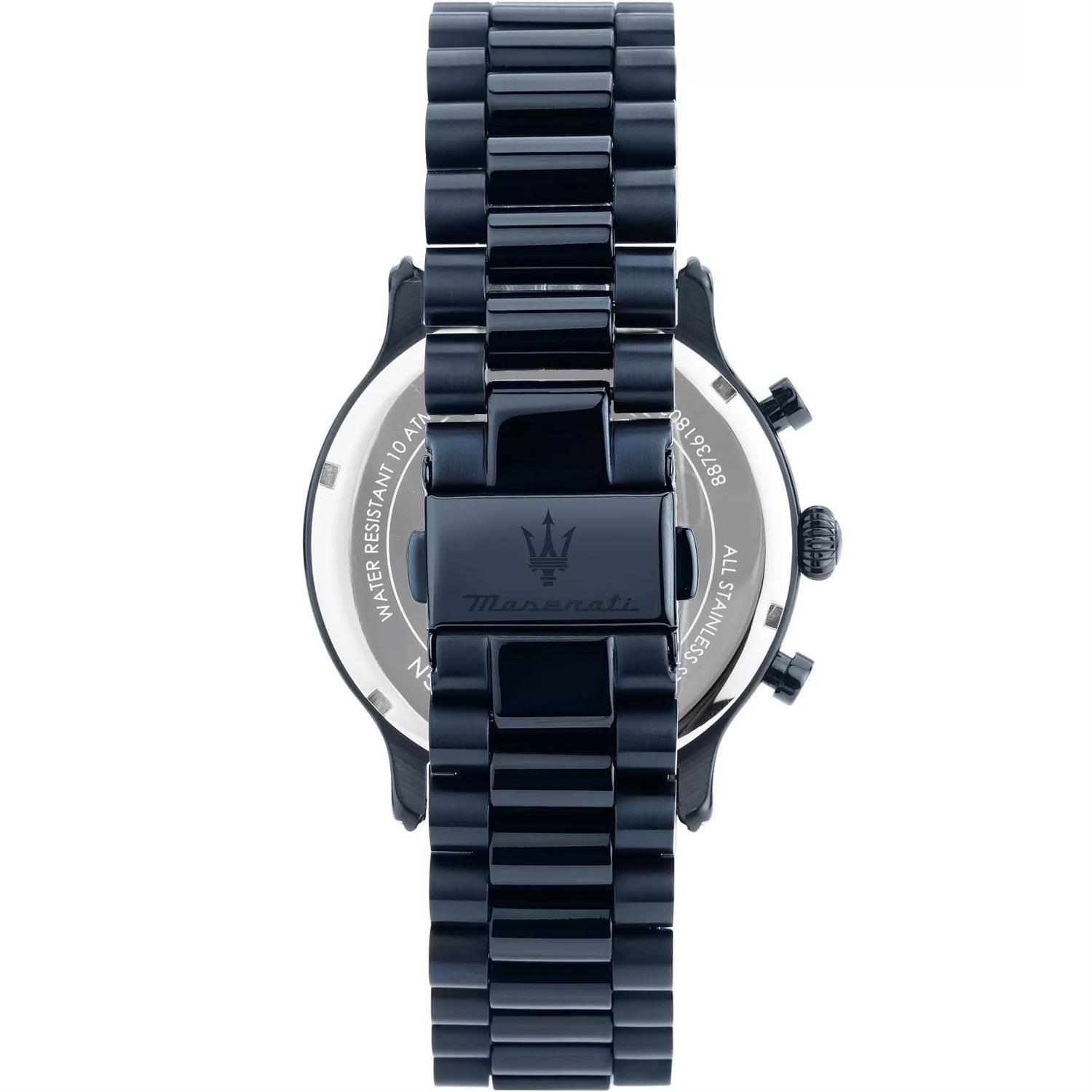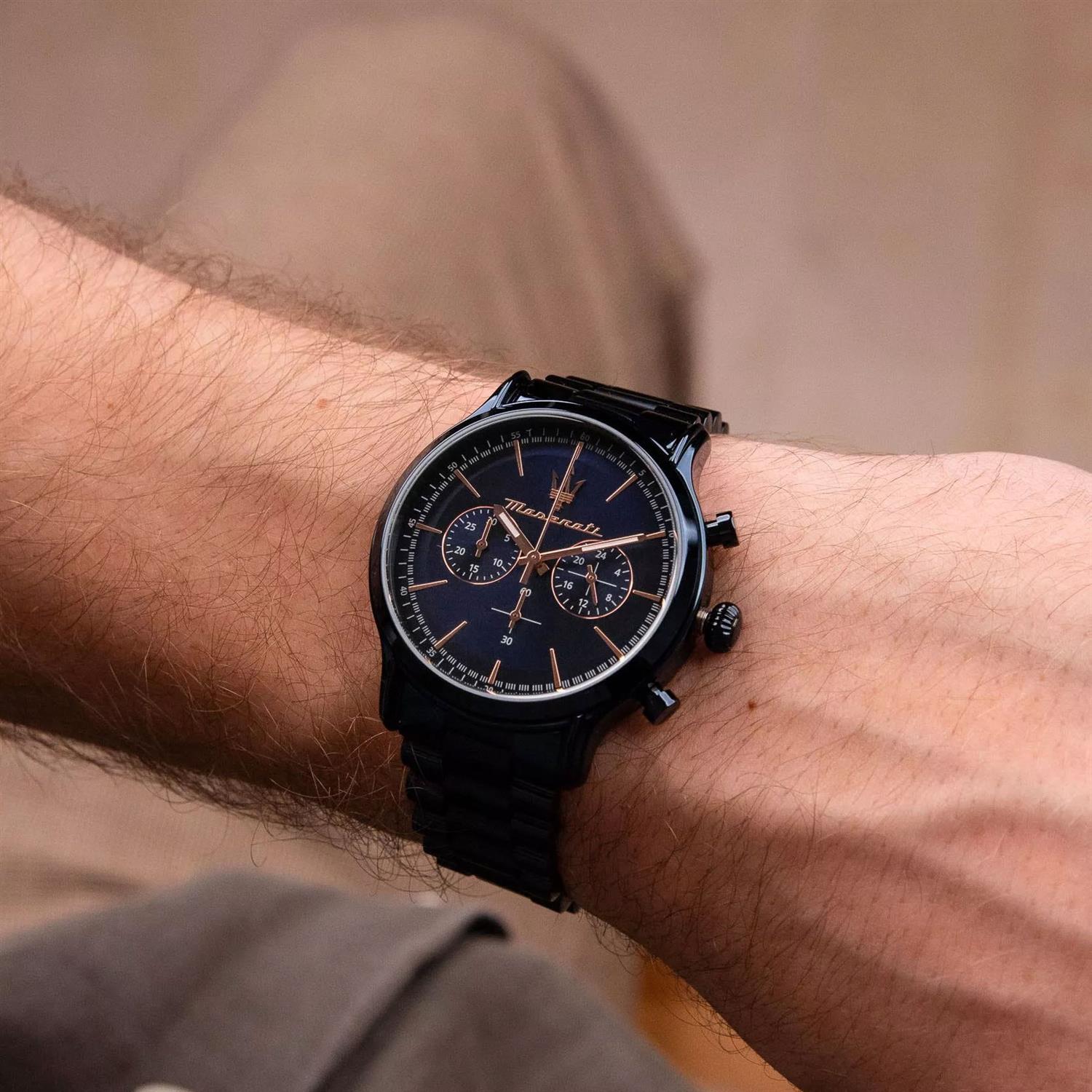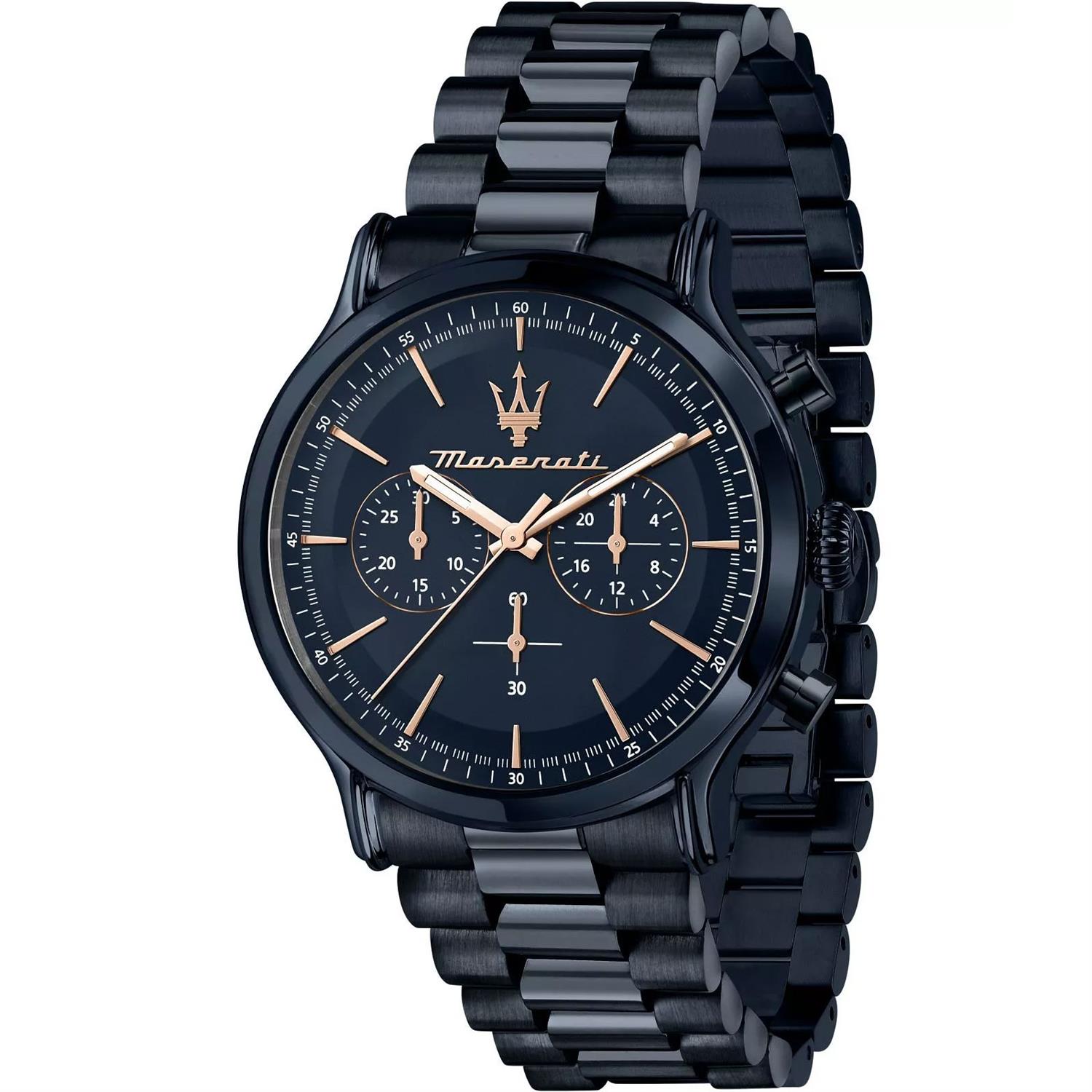 ساعت مچی مردانه مازراتی maserati با طراحی کلاسیک بند فلزی سرمه ای و قاب گرد سرمه ای و صفحه گرد سرمه ای و قابلیت داشتن کرنوگراف شب نما با موتور ژاپنی و انرژی باتری و مقاوم در برابر آب تا عمق 100 متر به همراه گارانتی بین المللی