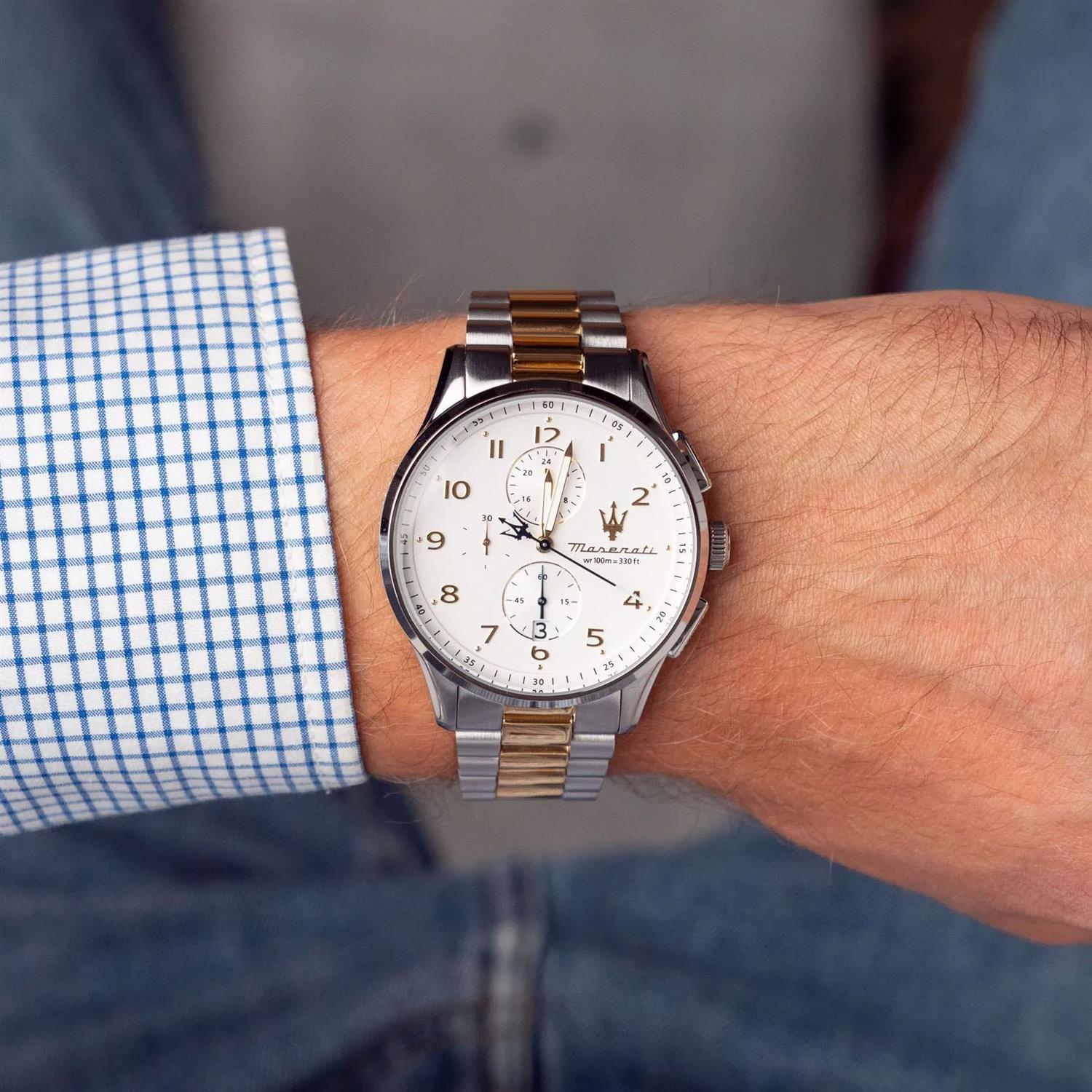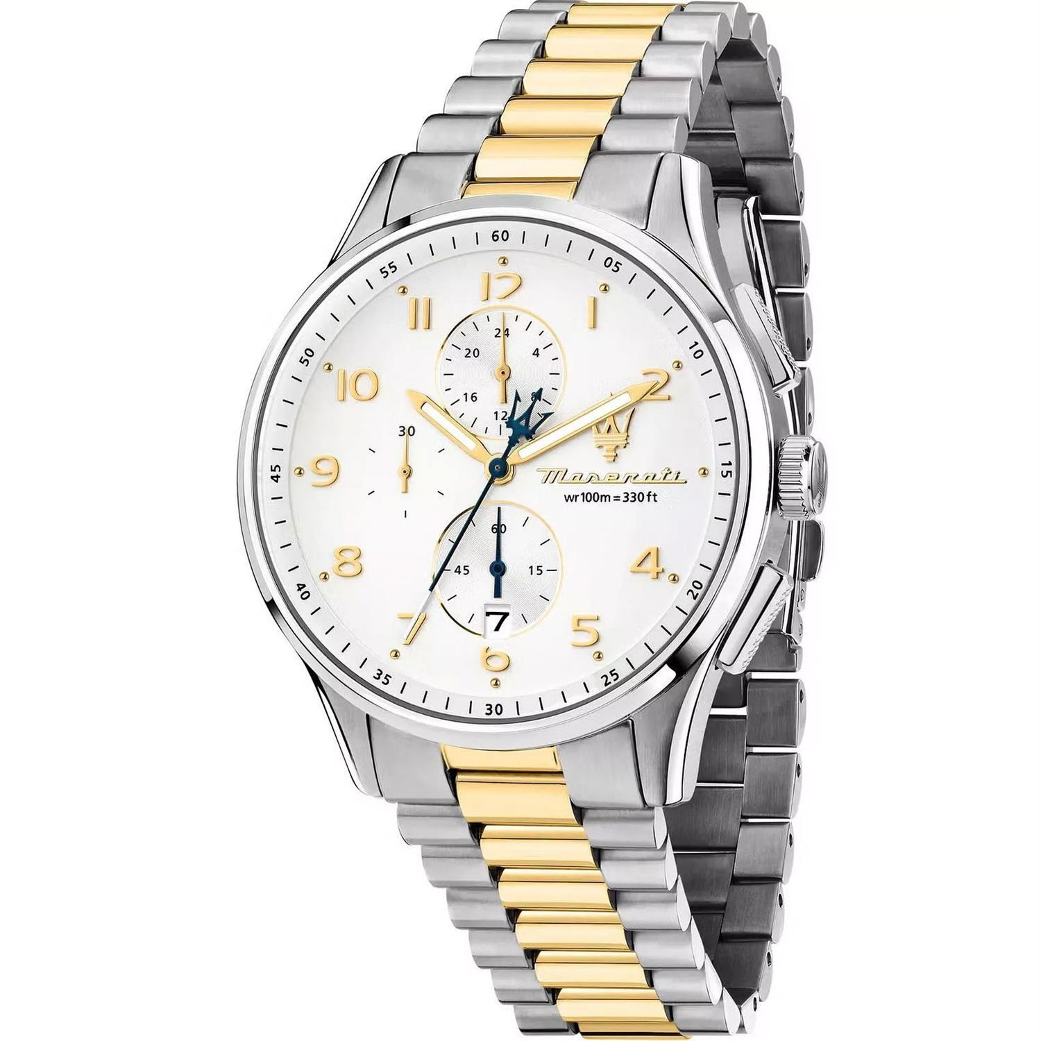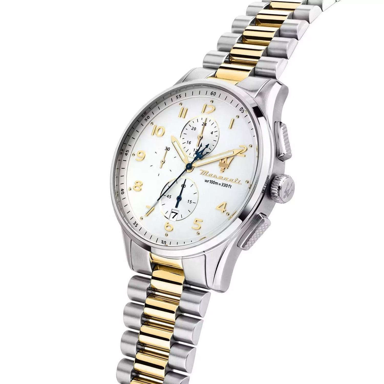 ساعت مچی مردانه مازراتی maserati با طراحی کلاسیک بند استیل طلایی و قاب گرد استیل و صفحه گرد سفید و قابلیت داشتن کرنوگراف تقویم شب نما با موتور ژاپنی و انرژی باتری و مقاوم در برابر آب تا عمق 100 متر به همراه گارانتی بین المللی