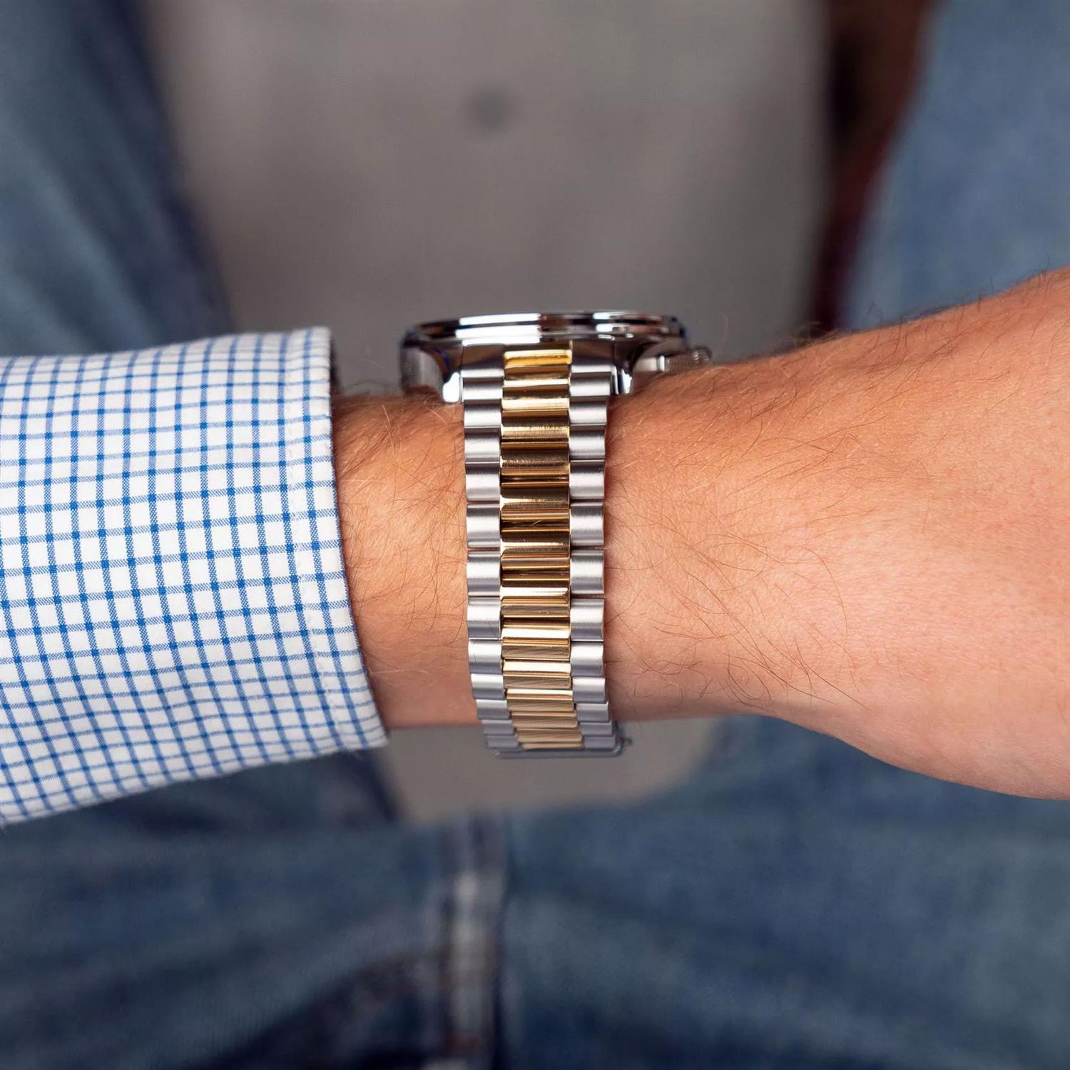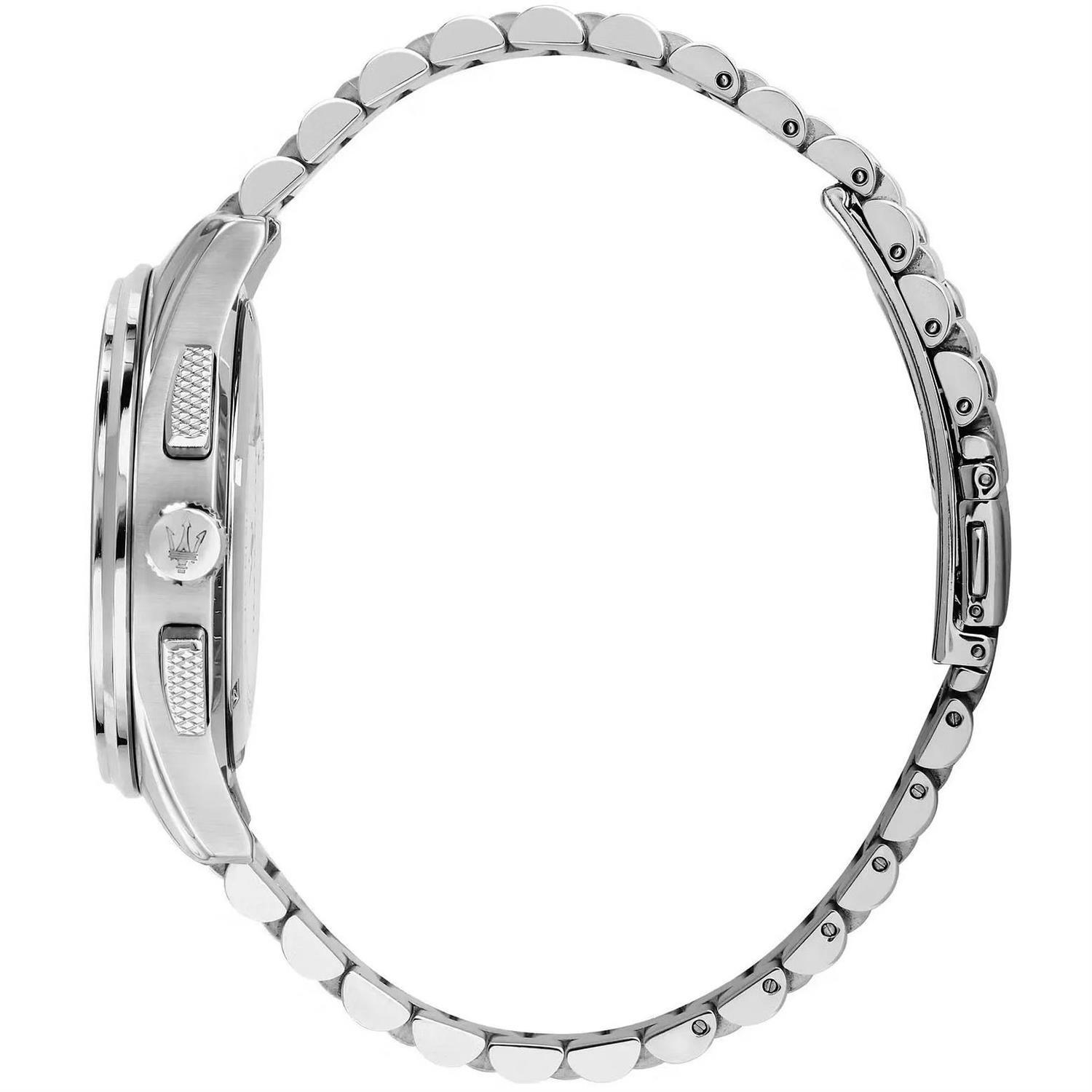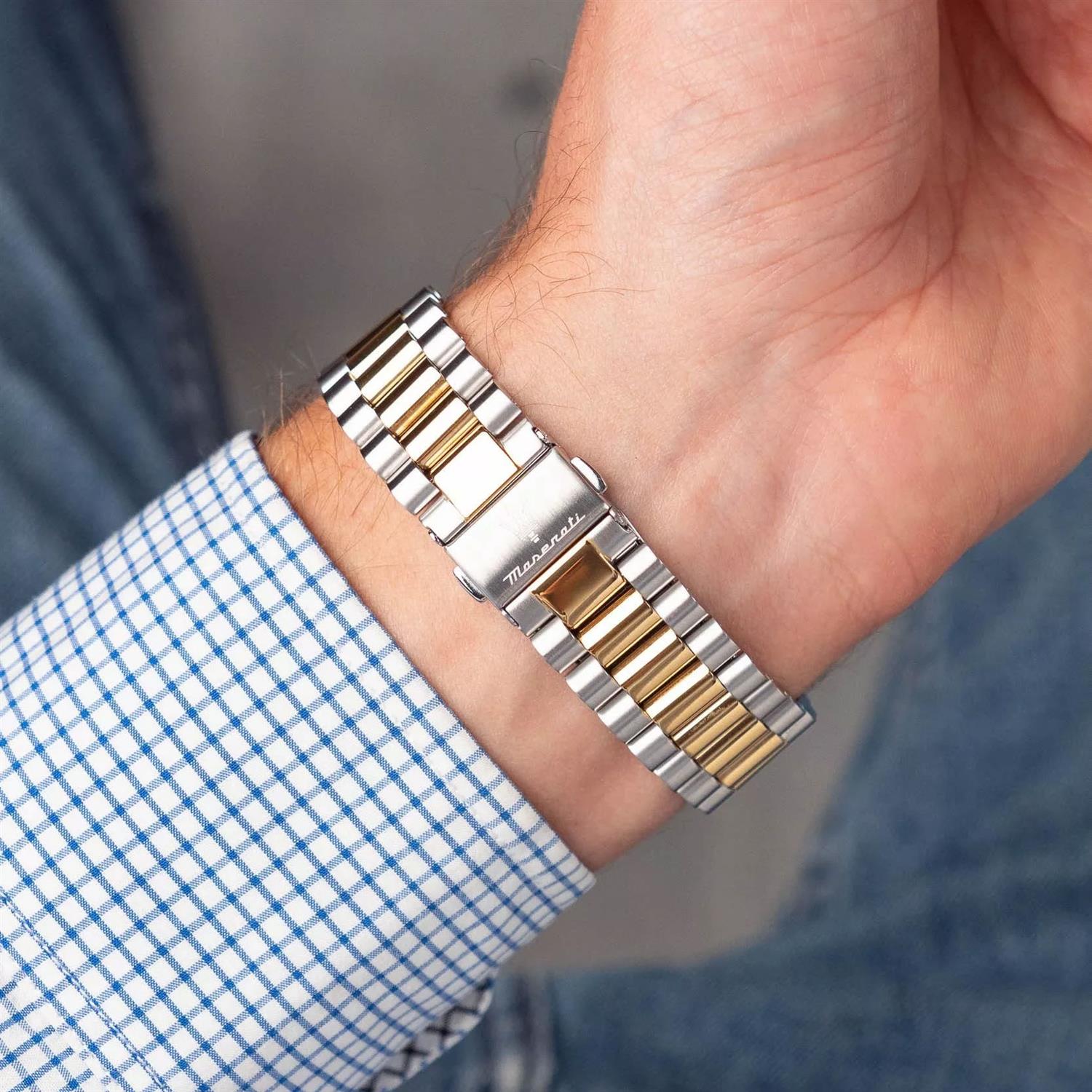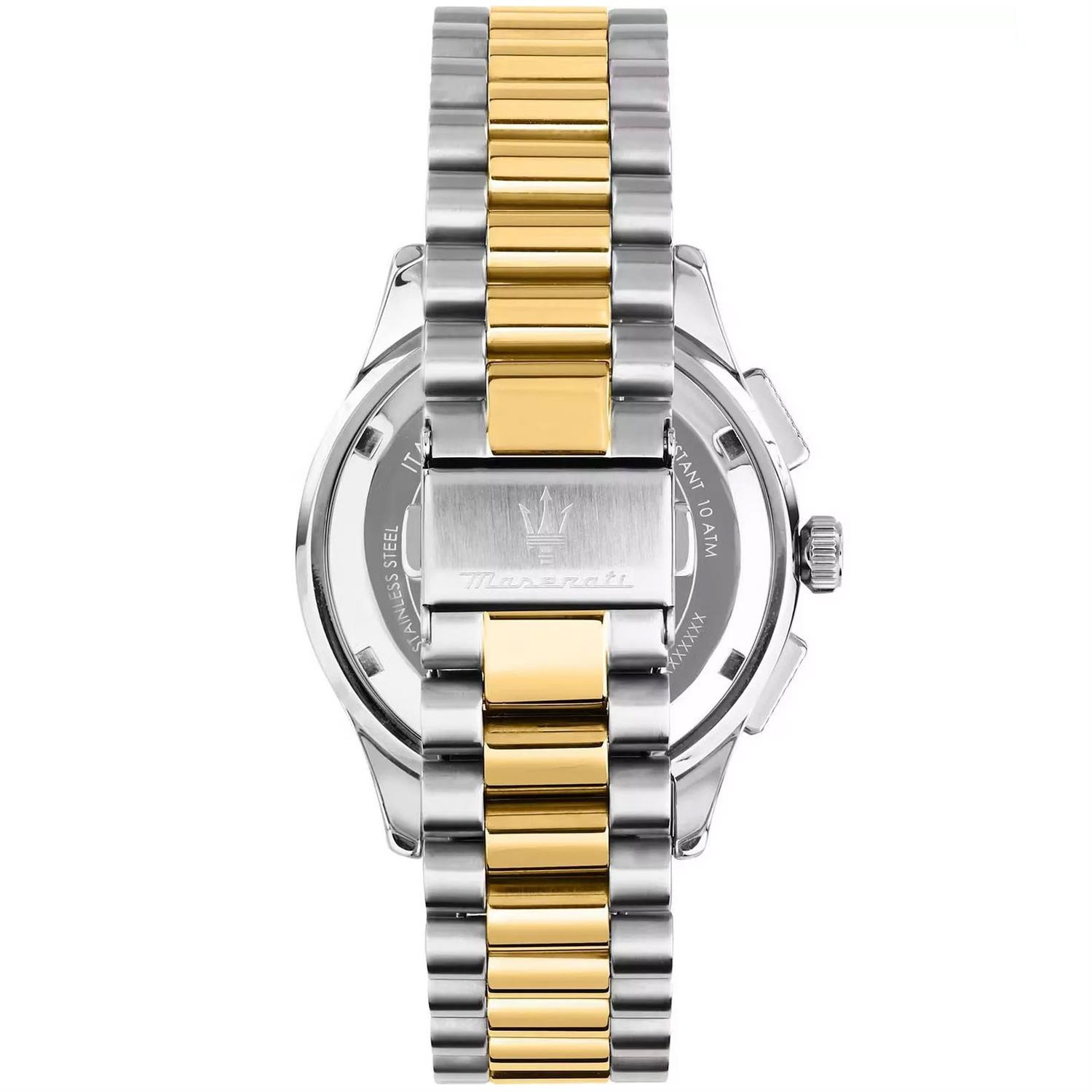 ساعت مچی مردانه مازراتی maserati با طراحی کلاسیک بند استیل طلایی و قاب گرد استیل و صفحه گرد سفید و قابلیت داشتن کرنوگراف تقویم شب نما با موتور ژاپنی و انرژی باتری و مقاوم در برابر آب تا عمق 100 متر به همراه گارانتی بین المللی