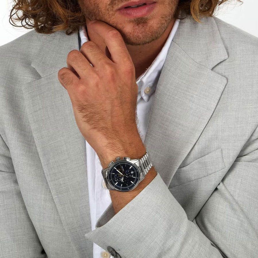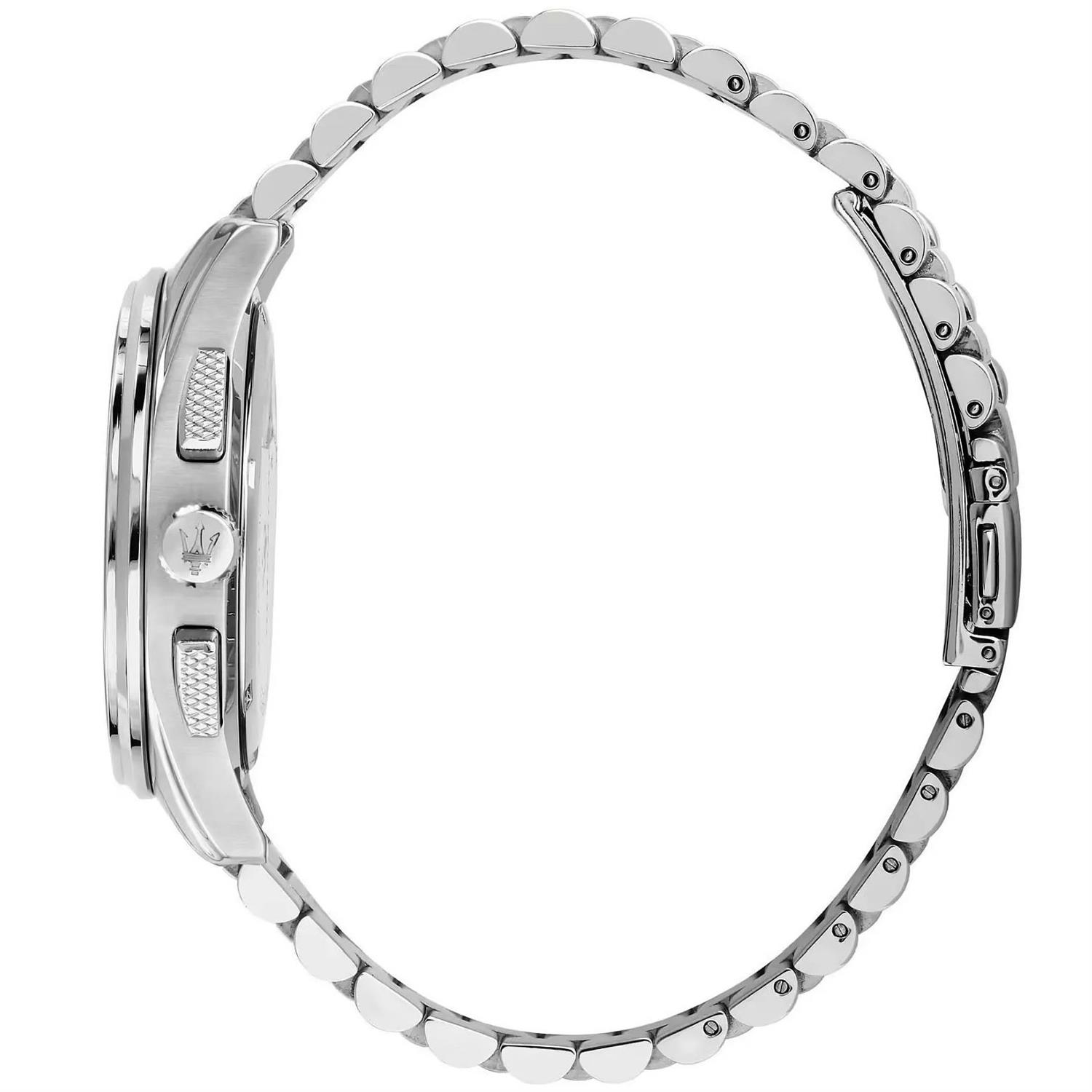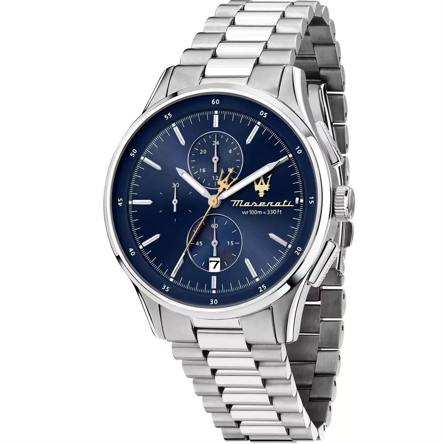 ساعت مچی مردانه مازراتی maserati با طراحی کلاسیک بند استیل و قاب گرد استیل و صفحه گرد سرمه ای و قابلیت داشتن کرنوگراف تقویم شب نما با موتور ژاپنی و انرژی باتری و مقاوم در برابر آب تا عمق 100 متر به همراه گارانتی بین المللی