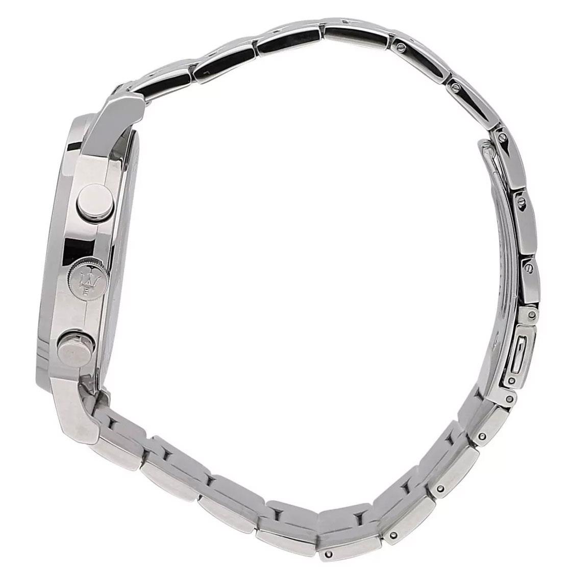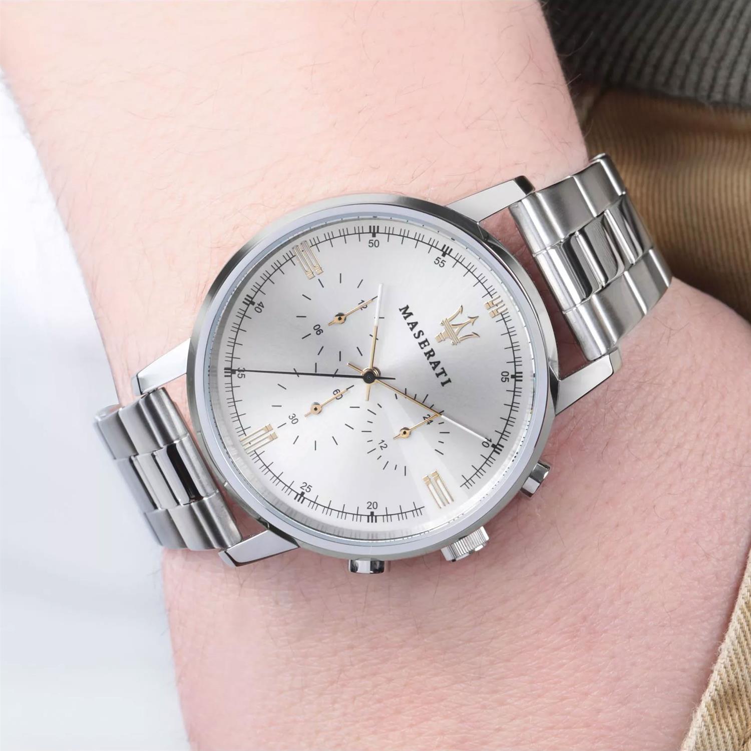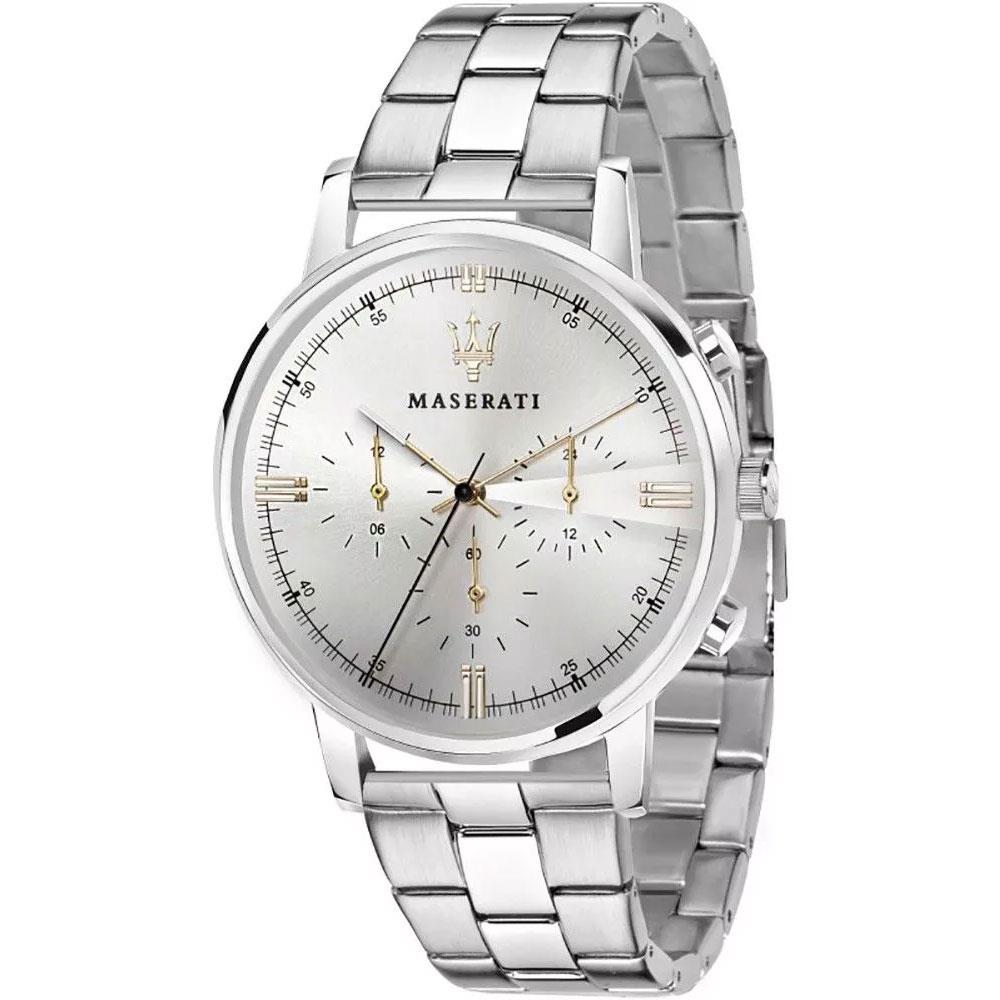 ساعت مچی مردانه مازراتی maserati با طراحی کلاسیک بند استیل و قاب گرد استیل و صفحه گرد نقره ای و قابلیت داشتن کرنوگراف با موتور ژاپنی و انرژی باتری و مقاوم در برابر آب تا عمق 50 متر به همراه گارانتی بین المللی