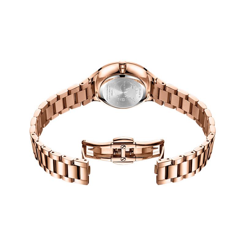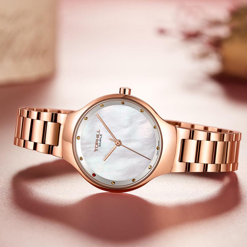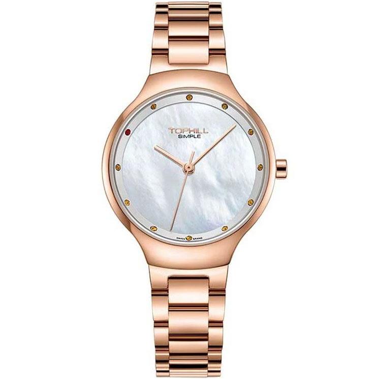 ساعت مچی زنانه تاپ هیل tophill با طراحی روزانه بند فلزی مسی و قاب گرد مسی با صفحه گرد سفید صدفی و شیشه ضد خراش و موتور ژاپنی با انرژِی باتری و مقاوم در برابر آب تا عمق 50 متر به همراه گارانتی بین المللی
