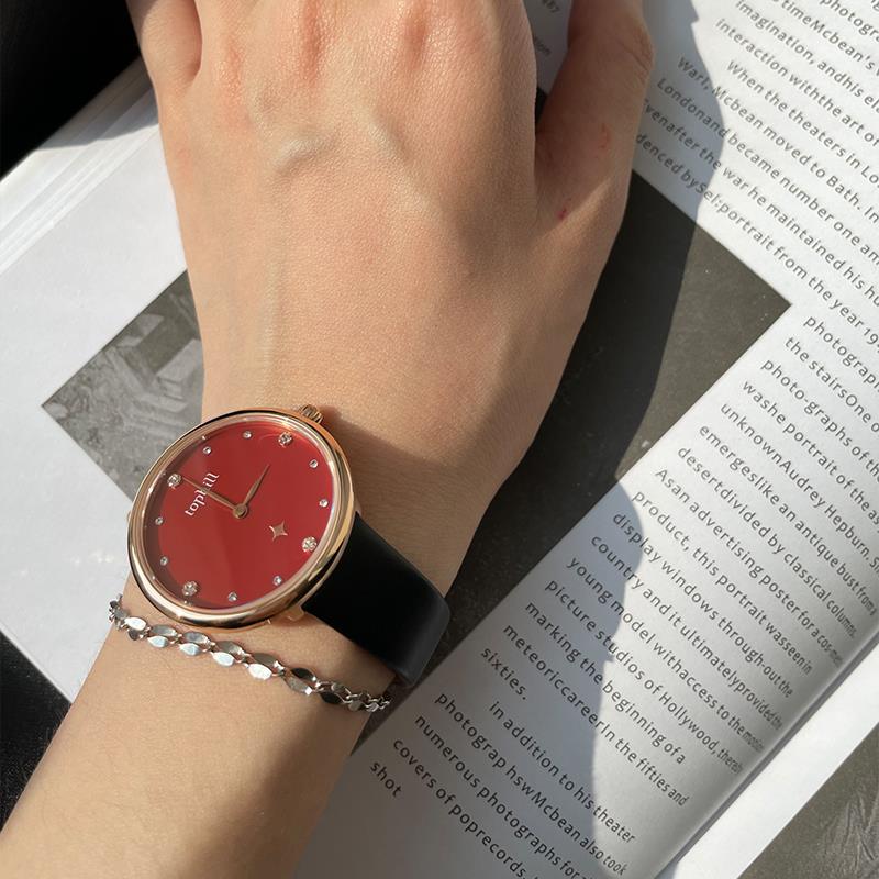 ساعت مچی زنانه تاپ هیل tophill با طراحی روزانه بند چرمی مشکی و قاب گرد مسی با صفحه مزین به نگین قرمز و شیشه ضد خراش و موتور ژاپنی با انرژِی باتری و مقاوم در برابر آب تا عمق 30 متر به همراه گارانتی بین المللی