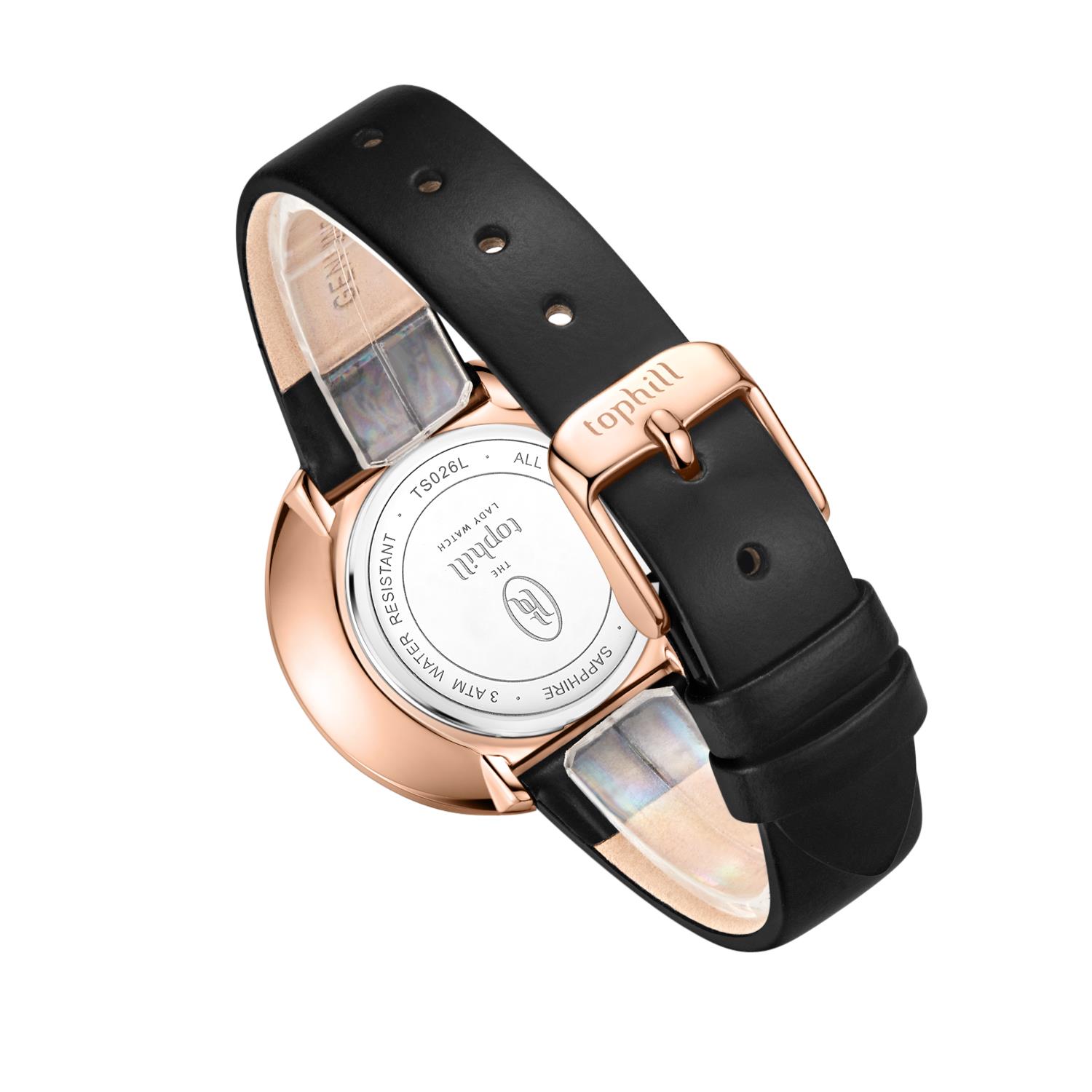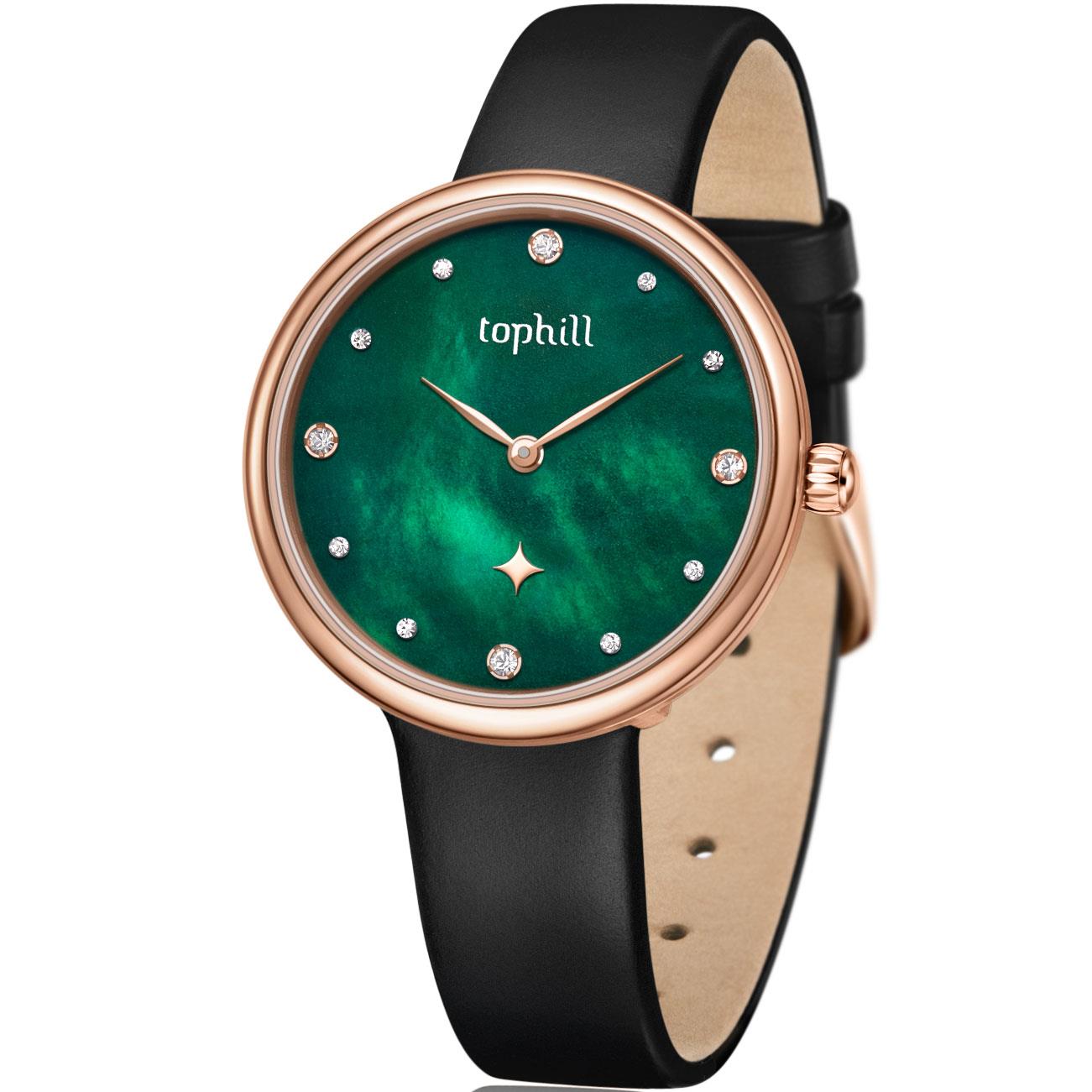 ساعت مچی زنانه تاپ هیل tophill با طراحی روزانه بند چرمی مشکی و قاب گرد مسی با صفحه مزین به نگین سبز صدفی وشیشه ضد خراش و موتور ژاپنی با انرژِی باتری و مقاوم در برابر آب تا عمق 30 متر به همراه گارانتی بین المللی