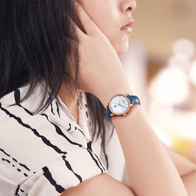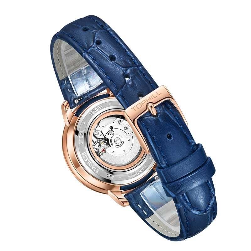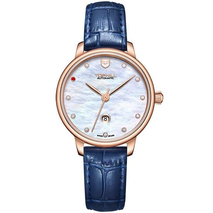 ساعت مچی زنانه تاپ هیل tophill با طراحی روزانه بند چرمی سرمه ای و قاب فلزی مسی با صفحه مزین به نگین سفید صدفی و شیشه ضد خراش با قابلیت داشتن تقویم  و موتوراتوماتیک ژاپنی با انرژِی مکانیکی و مقاوم در برابر آب تا عمق 50 متر به همراه گارانتی بین المللی
