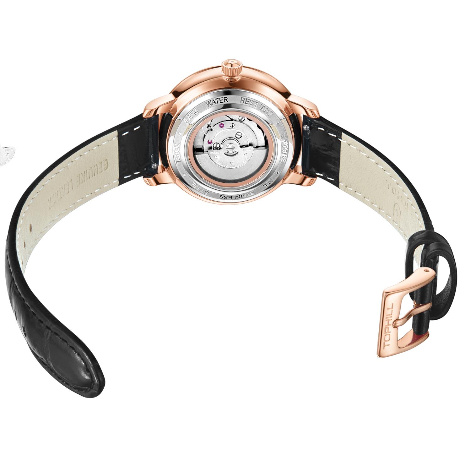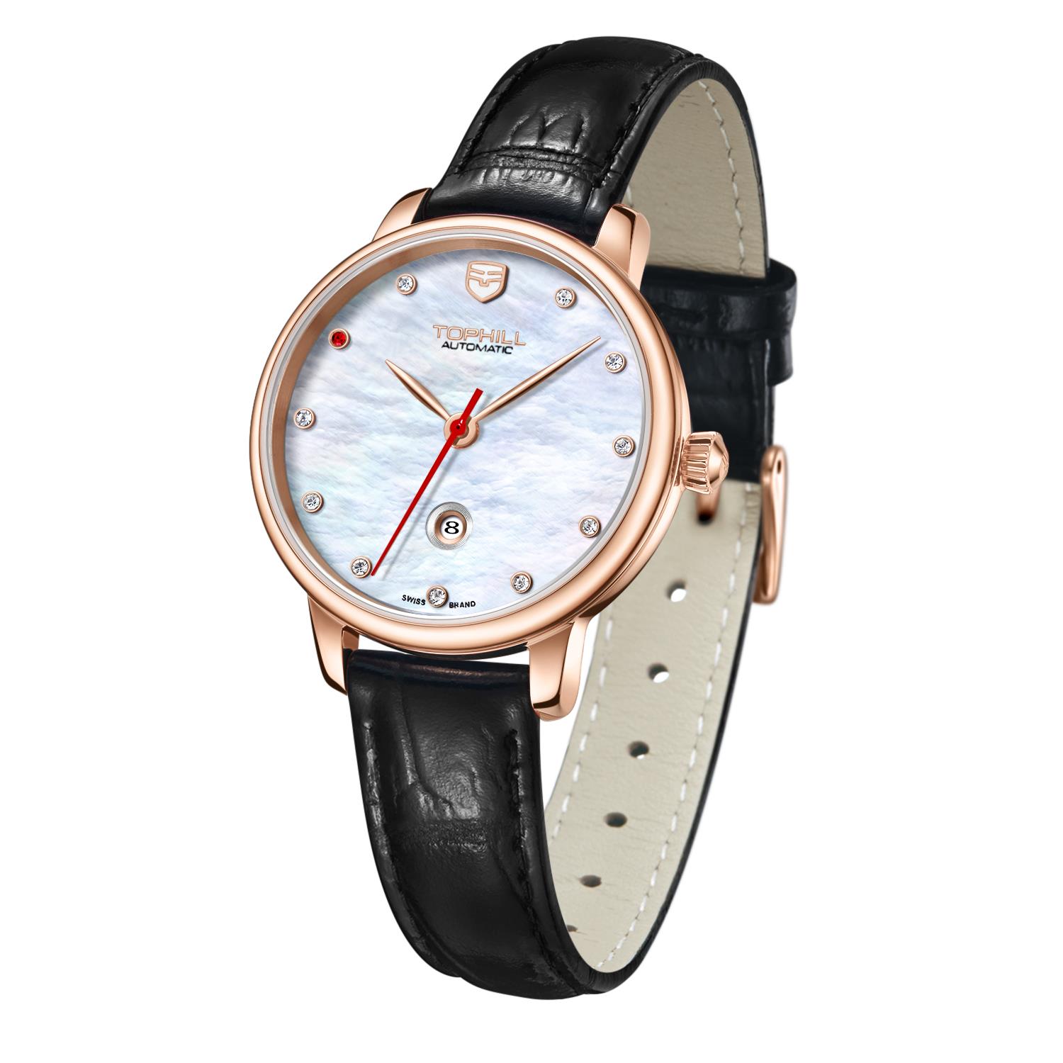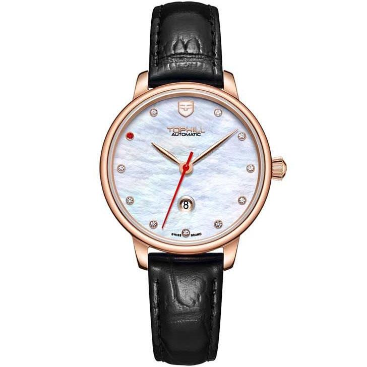 ساعت مچی زنانه تاپ هیل tophill با طراحی روزانه بند چرمی و قاب فلزی مسی با صفحه مزین به نگین سفید صدفی و شیشه ضد خراش با قابلیت داشتن تقویم و موتوراتوماتیک ژاپنی با انرژِی مکانیکی و مقاوم در برابر آب تا عمق 50 متر به همراه گارانتی بین المللی