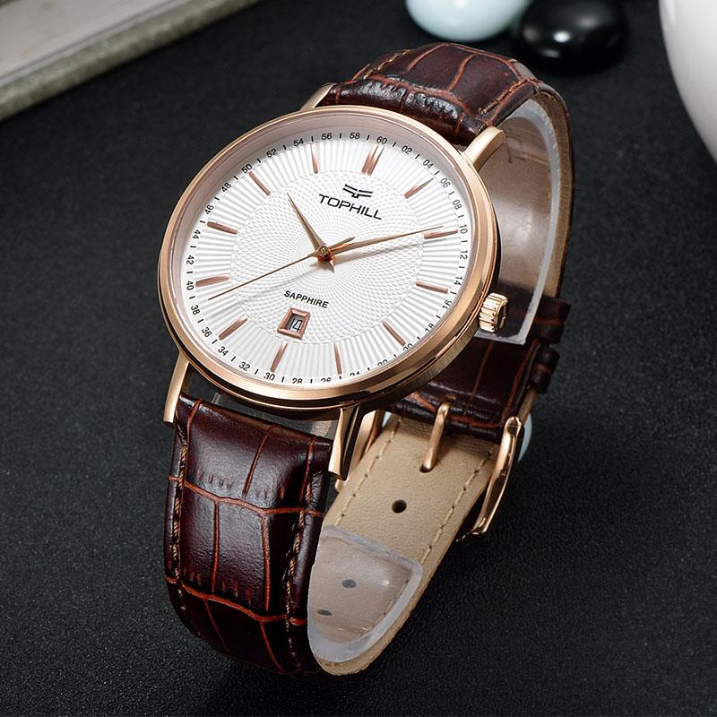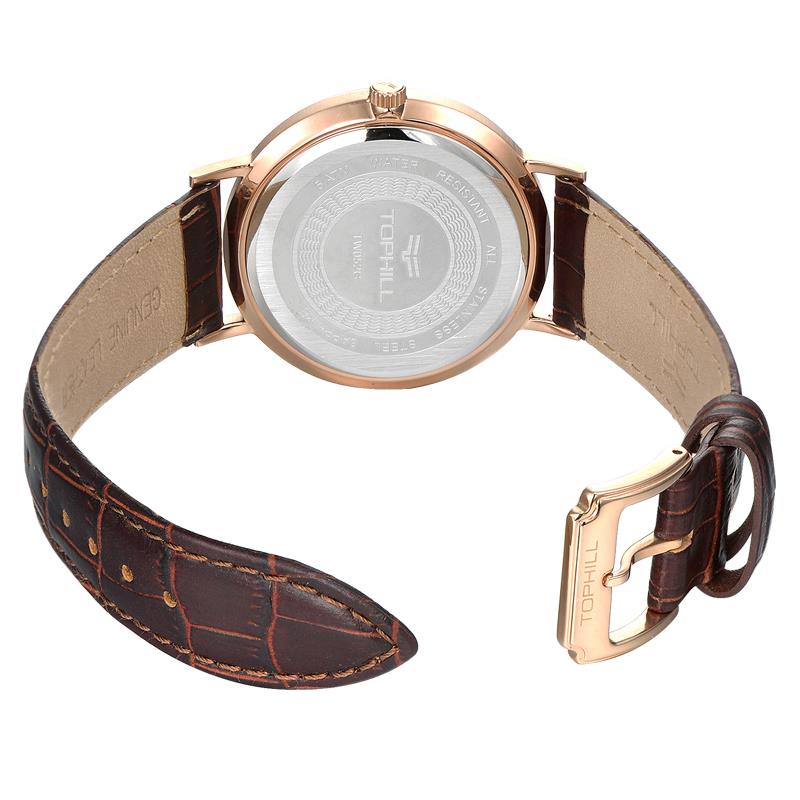 ساعت مچی مردانه تاپ هیل tophill با طراحی روزانه بند چرمی قهوه ای و قاب فلزی مسی و صفحه گرد سفید با شیشه ضد خراش و قابلیت داشتن تقویم و موتور ژاپنی با انرژی باتری و مقاوم در برابر آب تا عمق 30 متر به همراه گارانتی بین المللی