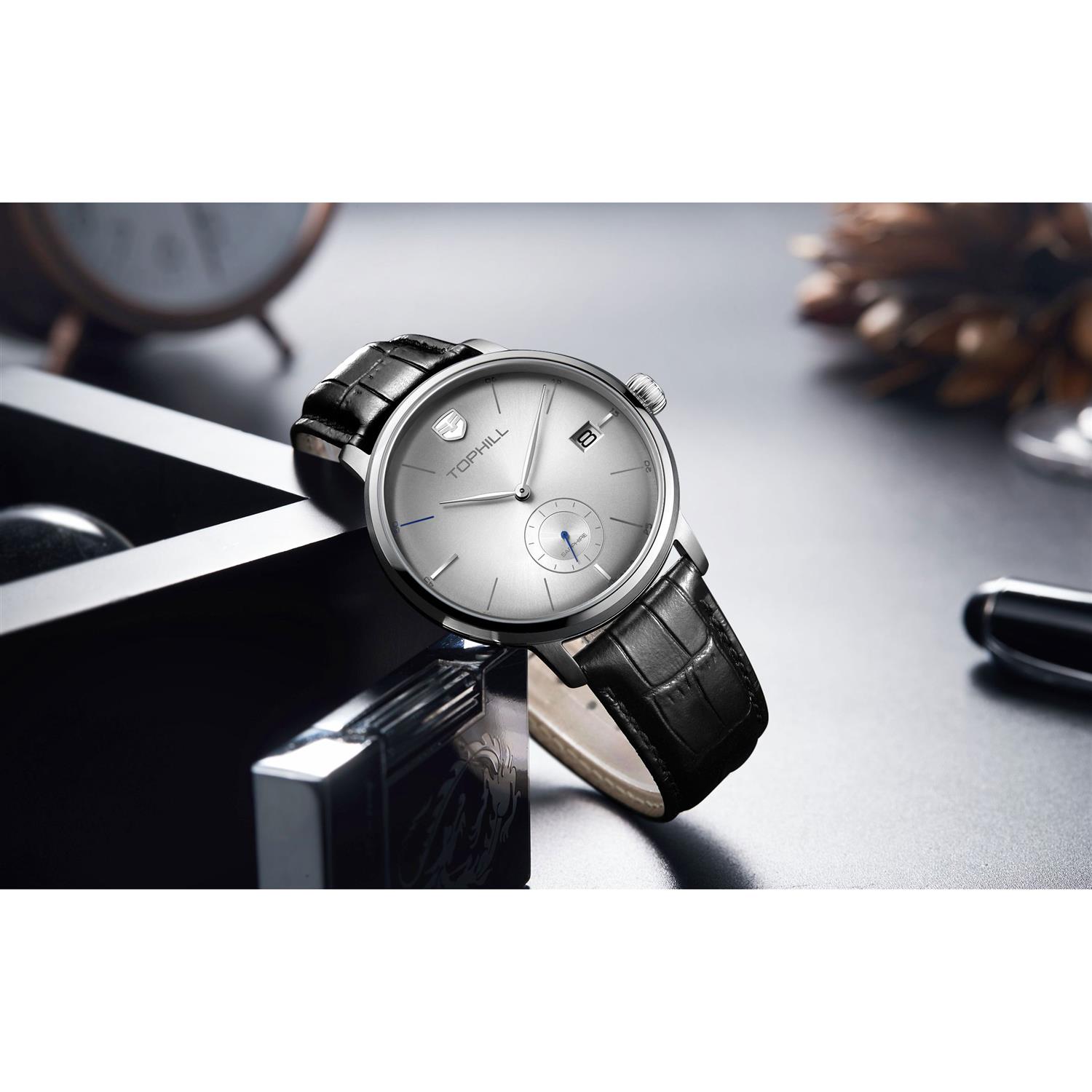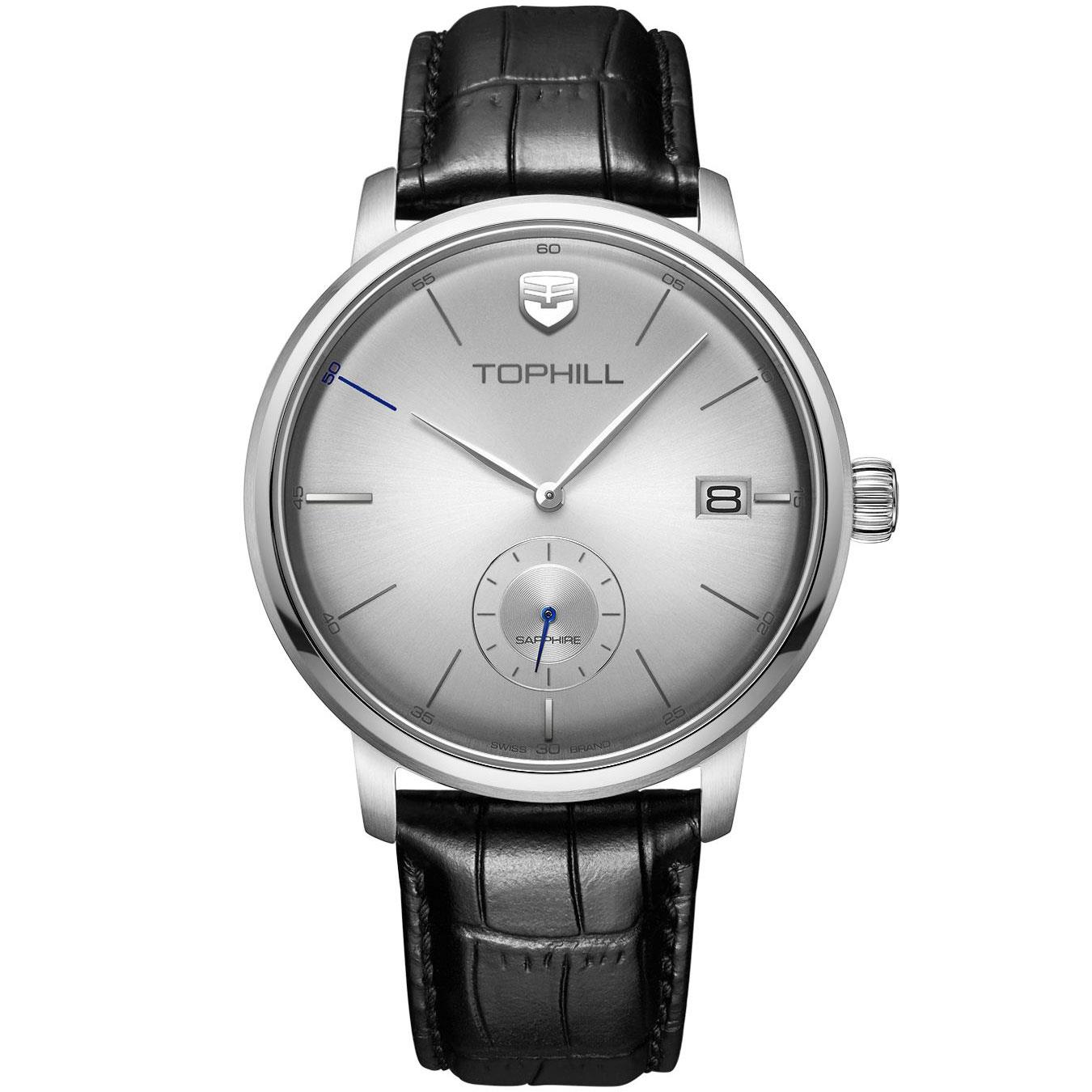 ساعت مچی مردانه تاپ هیل tophill با طراحی روزانه بند چرمی مشکی و قاب گرد استیل و صفحه گرد نقره ای با شیشه ضد خراش و قابلیت داشتن تقویم زیر ثانیه و موتور ژاپنی با انرژی باتری و مقاوم در برابر آب تا عمق 50 متر به همراه گارانتی بین المللی