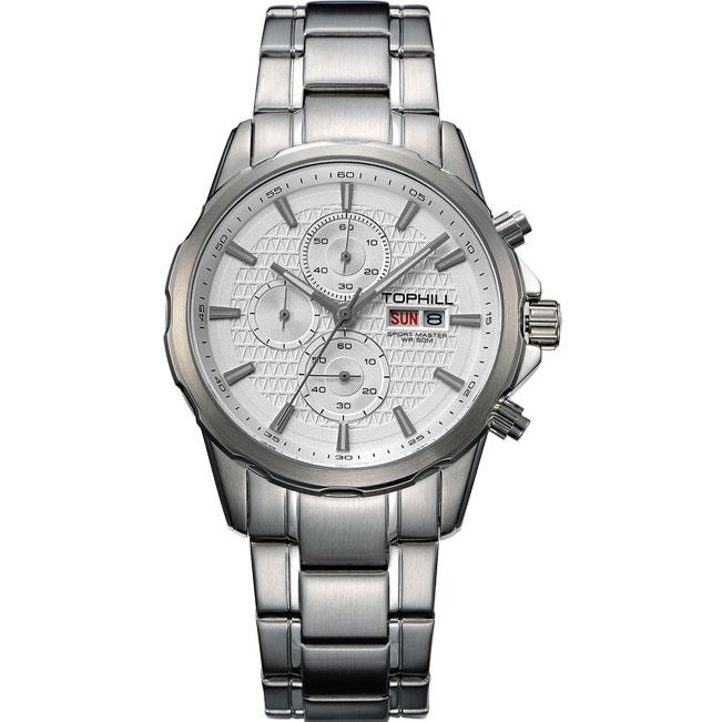 ساعت مچی مردانه تاپ هیل tophill با طراحی اسپرت بند استیل و قاب گرد استیل و صفحه گرد سفید و قابلیت داشتن تقویم کرنوگراف شب نما روزهای هفته و موتور ژاپنی با انرژی باتری و مقاوم در برابر آب تا عمق 50 متر به همراه گارانتی بین المللی