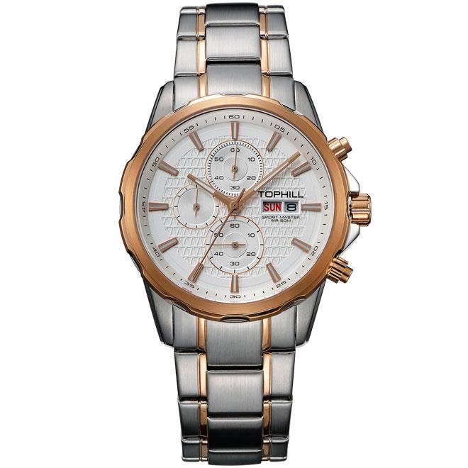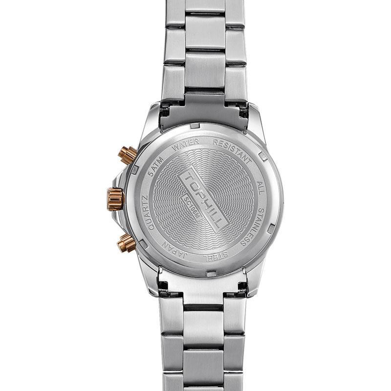 ساعت مچی مردانه تاپ هیل tophill با طراحی اسپرت بند استیل مسی و قاب گرد مسی استیل و صفحه گرد سفید و قابلیت داشتن تقویم کرنوگراف شب نما روزهای هفته و موتور ژاپنی با انرژی باتری و مقاوم در برابر آب تا عمق 50 متر به همراه گارانتی بین المللی