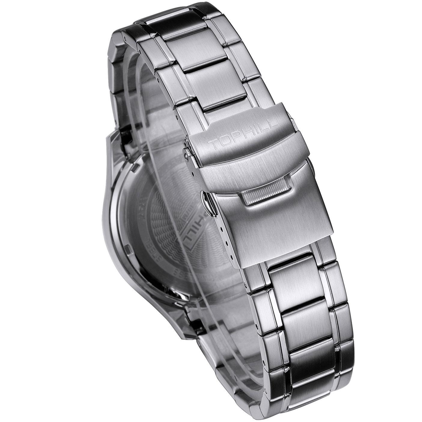 ساعت مچی مردانه تاپ هیل tophill با طراحی اسپرت بند استیل و قاب گرد استیل و صفحه گرد سفید با شیشه ضد خراش و قابلیت داشتن تقویم کرنوگراف شب نما زه تاچی متر و موتور ژاپنی با انرژی باتری و مقاوم در برابر آب تا عمق 50 متر به همراه گارانتی بین المللی