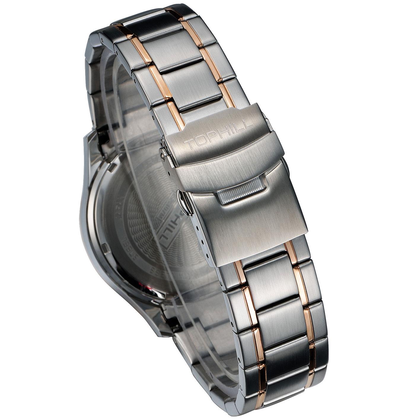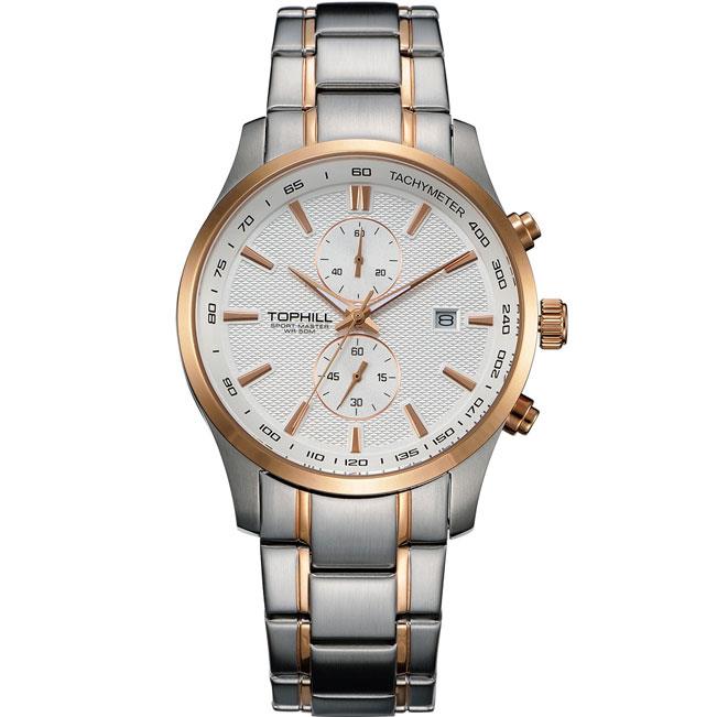 ساعت مچی مردانه تاپ هیل tophill با طراحی اسپرت بند استیل مسی و قاب گرد مسی استیل و صفحه گرد سفید با شیشه ضد خراش و قابلیت داشتن تقویم کرنوگراف شب نما زه تاچی متر و موتور ژاپنی با انرژی باتری و مقاوم در برابر آب تا عمق 50 متر به همراه گارانتی بین المللی