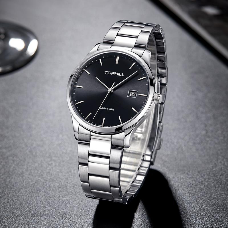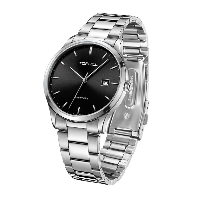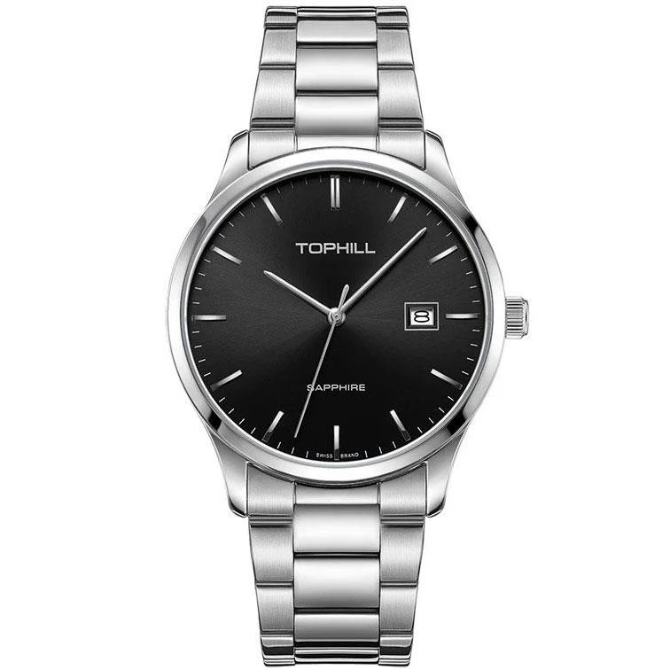 ساعت مچی مردانه تاپ هیل tophill با طراحی اسپرت بند استیل و قاب گرد استیل و صفحه گرد مشکی با شیشه ضد خراش و قابلیت داشتن تقویم و موتور ژاپنی با انرژی باتری و مقاوم در برابر آب تا عمق 30 متر به همراه گارانتی بین المللی